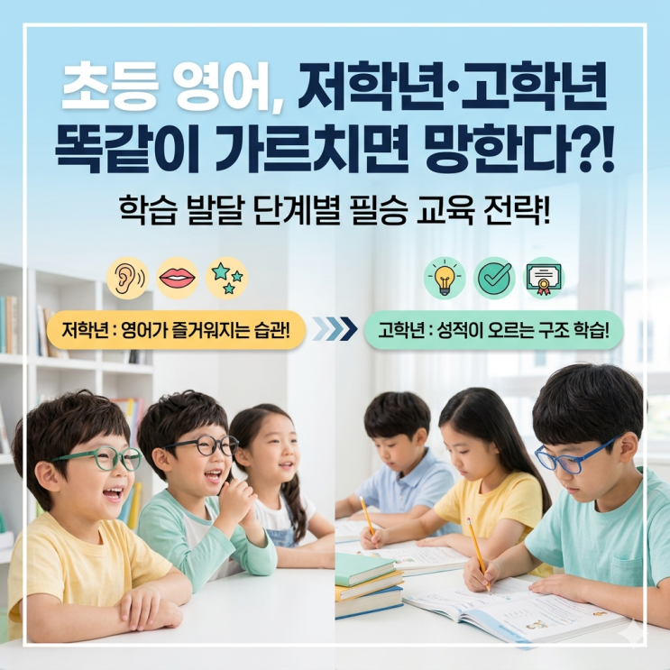 학부모님들과 상담을 하다 보면 자주 듣는 질문이 있습니다. “초등 영어는 그냥 비슷하게 가르치는 거 아닌가요?” 결론부터 말씀드리면, 절대 그렇지 않습니다. 저학년과 고학년은 학습 발달 단계 자체가 다르기 때문에, 같은 방식으로 가르칠 경우 오히려 학습 효과가 떨어질 수 있습니다. 그래서 저희 학원은 학년이 아니라 ‘학습 발달 단계’에 맞춰 영어 교육 전략을 완전히 다르게 설계합니다. 1. 저학년 영어는 ‘실력’보다 ‘습관과 감각’이 먼저입니다 초등 저학년 시기는 언어를 ‘공부’로 받아들이기보다 ‘익숙함’으로 받아들이는 시기입니다. 이 시기에 가장 중요한 것은 단어를 많이 아는 것도, 문법을 정확히 아는 것도 아....... <img src="https://blogthumb.pstatic.net/MjAyNjA0MjBfNTUg/MDAxNzc2NjE0MTE0ODc0.TJ7RwpDepuYL0tcLDctWh_t4Vl7ZEvGph3D-PYN_Jjwg.Pq3_y5ZXWe9mFcTDj-_eavpemFbIWJcunQI3DMwk4RYg.PNG/KakaoTalk_20260420_005346205.png?type=s3" />