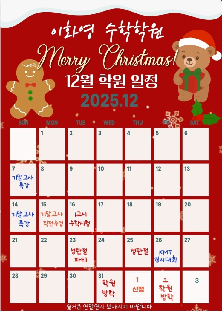 따뜻한 12월, 새로운 시작을 준비하며~ 안녕하세요, 마들역수학학원 이화영수학 원장 인사드립니다. 한 해의 마무리를 앞둔 12월, 학생들과 학부모님 모두 올 한 해 고생 많으셨습니다. 12월 학원 주요 일정 기말고사 대비 특강 이번 12월에는 상경중학교 기말고사 대비 특강, 개별 보충수업, 주말 학습 프로그램 등 집중 관리가 진행됩니다. 기말고사에 대비하여 학생 한 명 한 명의 취약점을 빠르게 보완하고 실전 감각을 높일 수 있도록 커리큘럼을 강화했습니다. - 11월 30일(일) 저녁 7시~ 9시 30분 - 12월 7일(일) 오후 3시~6시 - 12월 14일(일) 오후3시~6시 - 12월 15일(월) 시험 직전 특강 오후5시~8시 - 12월 16일(화) 1교....... <img src="https://blogthumb.pstatic.net/MjAyNTEyMDFfMjE1/MDAxNzY0NTkwMDYwODc4.CXteKPw-yvkIHuiPUvn7lf0yXcmbnKPryG8rfDjbcuog.GoTB_1GT1aO9oHV2xCc5p4Zlu6M_ihhqQ5okHRfXI7Ig.JPEG/Screenshot%A3%DF20251201%A3%DF192633%A3%DFSamsung_Internet.jpg?type=s3" />