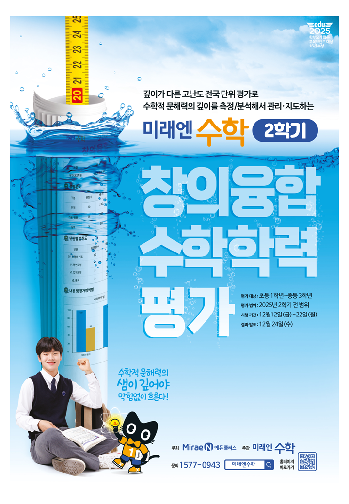 안녕하세요. 삼성영어 미래엔수학 효자학원입니다. 미래엔수학에서 매학기 실시하는 전국 창의융합평가를 저희 학원은 실시합니다. 저희 삼성영어 미래엔수학 효자학원은 12/12(금)-12/19(금) 기간동안 시험이 진행이 됩니다. 이번 시험은 총 30문항/ 90분 시험으로 시험 결과 발표는 12/24(수)에 할 예정입니다. 저희 학원 수학재원생은 모두 응시합니다. 이번 전국시험을 통해서 개인의 실력을 확인할 수 있어요. 이 시험은 비재원생도(응시료 1만원) 응시 가능해요. 12/17(수)까지 신청해주세요. 25년도 마지막 시험!! 모두 열심히 준비해서 좋은 성적 있기를 바래요. 화이팅!! ☎ 지금 신입상담과 진단평가 예약하세요.(무료) <img src="https://blogthumb.pstatic.net/MjAyNTEyMTBfMjk1/MDAxNzY1MzUyNDQ1MjE5.i9S46UEUktSMWQqXv5esJbkonJ8435kSMhZ6zdBuCFEg.A-6vYUTo7yT_ZatTsJ86WNHlguUleVH31KL0LIHxILEg.PNG/KakaoTalk_20251208_121411898.png?type=s3" />