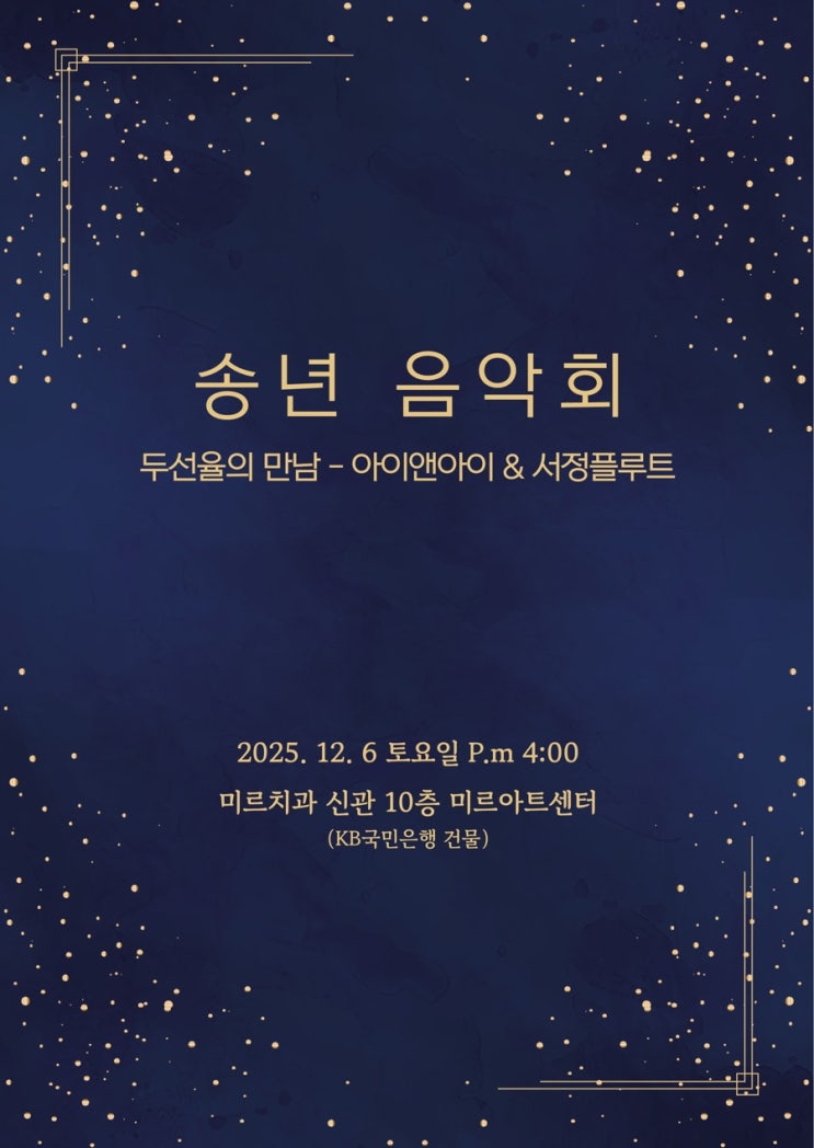 좋은 기회가 생겨 저희 학원 성인분들과 아이앤아이 음악학원 성인분들이 함께 송년음악회를 열게 되었습니다! 올해는 특히 성악팀과의 합동 공연까지 마련되어, 다양한 음악의 매력을 한 자리에서 느끼실 수 있는 더욱 풍성한 무대가 될 예정이에요 이번 송년음악회는 한 해 동안 꾸준히 연습하며 쌓아온 성과를 나누고, 서로의 음악적 성장을 응원하는 뜻깊은 자리입니다. 각 팀의 개성 있는 레퍼토리와 함께, 두 학원이 하나로 어우러지는 하이라이트 무대까지 준비되어 있어 관객 여러분께 색다른 감동을 전해드릴 것 같아요. 바쁜 일상 속에서도 음악을 사랑하는 마음으로 시간을 내어 연습해주신 모든 연주자분들께 감사드리며, 따뜻....... <img src="https://blogthumb.pstatic.net/MjAyNTEyMDVfMjc5/MDAxNzY0OTI3NzI5NTY1.617yftlO5bHb5o_33w9kTMF_I0mbVVAzyqx4bMuZf6Qg.U9aEpHa8Mk3LksIbELVAR78rLtw6ZKW7iwm3fYQ0yjYg.JPEG/IMG%A3%DF7917.jpg?type=s3" />