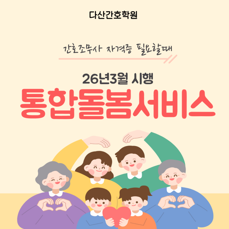2026년 3월부터 국가통합돌봄서비스가 본격 시행되며 지역 중심 돌봄이 더욱 확대됩니다. 오늘은 통합돌봄 시대와 간호조무사 자격증이 왜 잘 어울리는지 준비는 어떻게 해야 하는지 정리해드릴게요 통합돌봄서비스는 노인, 장애인 등 돌봄이 필요한 사람이 자시닝 살던 곳에서 주거, 보건의료, 요양복지서비스를 한데 묶어 지원받는 체계 병원이나 시설에 머무르지 않고 가능한 한 자신이 가장 편하게 느끼는 집 또는 지역에서 자신의 건강이나 경제 상황 등에 맞게 개인맞춤형 서비스를 제공받는것이 핵심 특히 간호조무사는 방문간호, 요양돌봄기관의료지원등 일선에서 역할이 기대됩니다. 간호조무사자격증은 통합돌봄 시대의 '실무형 돌....... <img src="https://blogthumb.pstatic.net/MjAyNTEyMTFfMjE5/MDAxNzY1NDEzNTY5MTY4.lR4xjkShLp23sKYBxSSqy883YtWHiSXTa2j93OfVwZMg.QjUnbHz1TMmym6E2BjCPM9RuovntdgbPWEzKo--Hm2Qg.PNG/%C1%A6%B8%F1%C0%BB_%C0%D4%B7%C2%C7%D8%C1%D6%BC%BC%BF%E4._%28100%29.png?type=s3" />