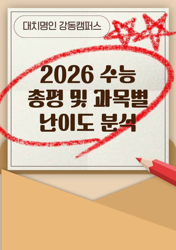 대치명인 강동캠퍼스입니다. 2026학년도 수능은 전반적으로 변별력이 강화되며 국어,수학,영어 모두 전년도 대비 난이도가 상승한 것으로 분석됩니다. 대치명인 입시센터장 이종환 전문가 분석 자료를 기반으로, 영역별 핵심만 보기 쉽게 정리해드렸으니 참고 해주세요:) ✅ 전체 총평: “킬러는 줄고, 전체 난도는 상승했다” ✔️ 국어, 수학, 영어 모두 작년보다 어려움 ✔️ 국어·수학은 중상 난도 문항이 증가, 상위권 변별력 강화 ✔️ 영어는 지문은 평이했지만, 오답 매력도 상승 → 체감 난이도 ↑ ✔️ 탐구 영역은 특히 ‘불 사탐’이라 불릴 만큼 난도 상승 ■ 국어 영역 화법과 작문을 제외한 언어와 매체, 독서, 문학 전 영역에서....... <img src="https://blogthumb.pstatic.net/MjAyNTEyMTNfMTIy/MDAxNzY1NTkyMzU2Njcy.fFSyvVk1umuIhHswPWEFFR7QtONchcpSDui8l-rMJJwg.W4lqSSDoClTqpqZ3S5HrdN2yEZVYzMIJTUGy5qyZVKcg.JPEG/%C1%A6%B8%F1%C0%BB_%C0%D4%B7%C2%C7%D8%C1%D6%BC%BC%BF%E4..jpg?type=s3" />