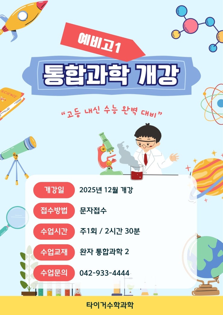 예비고1 통합과학 개강 안내 개강일 2025년 12월 수업시간 주 1회 / 2시간 30분 수업 교재 완자 통합과학 2 과정 안내 • 통합과학2 핵심 과정 완료 → 1월 중순부터 통합과학1 수업 시작 • 3월부터 내신 대비 문제풀이 • 4월 학교별 중간고사 대비 왜 지금 통합과학이 중요할까? 2026 교육과정부터 통합과학 내신 비율이 확대되며 국·영·수·과 네 과목의 내신 반영 비중이 동등해집니다. 즉, 통합과학은 ‘부담 적은 과목’이 아니라 성적을 결정짓는 핵심 과목! 지금부터 체계적으로 기초를 잡아두면 고1 내신이 훨씬 수월해집니다. ✨ 가장 현실적인! 성적 나오는 타이거수학과학 신청 학생들은 문자 남겨주시고, 자세....... <img src="https://blogthumb.pstatic.net/MjAyNTExMTlfMTE5/MDAxNzYzNTUyOTU4NTE1.XcVpRW14j6uRVWnpuD3Ifvie6uSrnVrC-X-IsYC-Y4Ig.lZ9Q6E7Yrcg6HtNETa-pSYMPBsIId2fZYuJN9HHfjOog.JPEG/%B0%ED1_%C5%EB%C7%D5%B0%FA%C7%D0_%B9%E6%B0%FA%C8%C4_%C7%D0%B1%B3_%284%29.jpg?type=s3" />