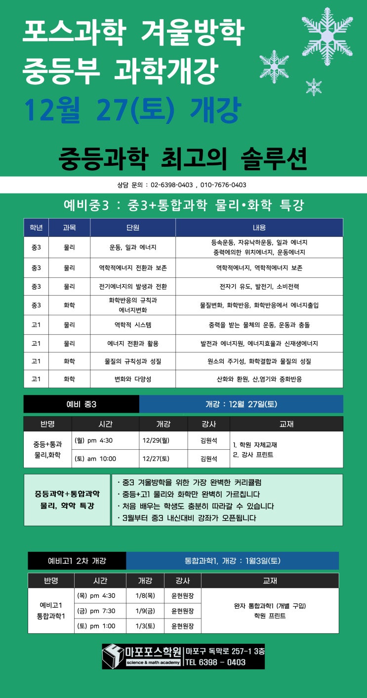 안녕하세요. 마포포스과학학원 원장 윤현 입니다 2025년 겨울방학에 진행되는 예비중3 과학수업 안내입니다 중등+통합과학의 물리+화학만 수업하는 특강 일반적인 예비중3 학생들이 방학때 할 수 있는 최고의 프로그램이라고 생각합니다. 중3 과정과 고등 통합과학은 많은 부분에서 연계가 되어있고 물리와 화학은 언제나 학생들이 가장 어려워하는 내용이 가득하기 때문에 이번 겨울방학에 딱!! 이 부분만 수업하는 강의는 매우 큰 도움이 될 수 있습니다 믿고 맡겨주신 아이들의 미래를 위해 고민하고, 연구하며 최선의 결과를 위해 노력하는 마포포스과학전문학원이 되겠습니다. 내일의 나는 오늘의 나보다 반드시 나을것이다 <img src="https://blogthumb.pstatic.net/MjAyNTEyMTRfNzUg/MDAxNzY1NzA0NDczOTI4.aAnM7NIAitQ3CBVCnescYJQxL0LfdbTUI8tjdlpPmfog.nogqzGDLfRY4IKEVKfM7-VZvEPui5DIVv6nd363DTR8g.JPEG/%B0%DC%BF%EF%B9%E6%C7%D0_%C1%DF%B5%EE%BA%CE_%BD%C3%B0%A3%C7%A5.jpg?type=s3" />