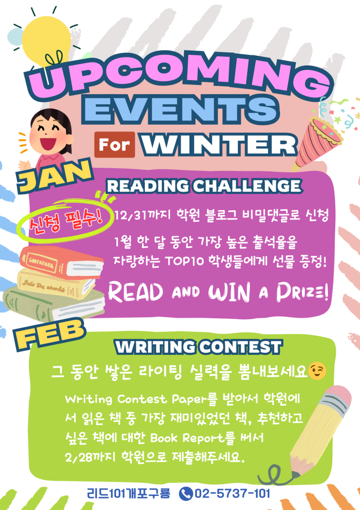 이번 겨울/봄 방학을 위해 준비한 EVENT를 소개합니다! 1월은 다시 돌아온 READING CHALLENGE! 1월 한 달 동안 가장 높은 출석률을 자랑하는 친구들 TOP10에게 선물 증정합니다 :) (PREP 학생들은 2월 말까지 진행할 예정입니다. TOP3 선물 증정♡) 신청 필수!! 신청한 친구들 한해서 진행되는 이벤트이며, 신청 기간: 12/31(수) 까지 신청 방법: 아래 비밀댓글로 "학생 이름 + 학교 + 학년"을 남겨주세요! 2월은 WRITING CONTEST를 진행합니다! 2/28(토)까지 학원에서 제공하는 Writing Paper에 학원에서 읽은 책 중 가장 재미있었던 책, 추천하고 싶은 책을 골라서 Book Report를 써서 제출해주세요. 심사 기준: 1) Good Handwriting....... <img src="https://blogthumb.pstatic.net/MjAyNTEyMTNfMjE4/MDAxNzY1NTkxMDU1MTAw.nlYhYgq3oPuTBZTAwBExMKWtf7McfFi4oQ-CfIvMlv4g.5DLsNbLBdYfufVR-m3mYvazzB-los6B9zHbeMQcRl_gg.PNG/2025%B0%DC%BF%EF%B9%E6%C7%D0_%C0%CC%BA%A5%C6%AE.png?type=s3" />