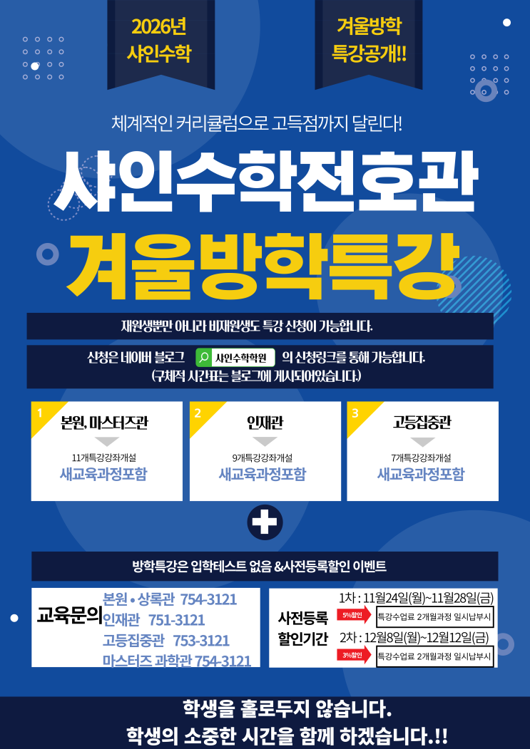 안녕하세요. 대구 범어동에 위치한 수학전문학원 샤인수학학원입니다. 오늘은 많이 기다리시던 샤인수학 전호관 2026년 겨울방학특강 시간표 를 공개합니다. 접수기간은 11월 15일(토)~개강전 까지입니다.. 각호관 과목과 시간 잘 살펴보시고 각호관별로 수강신청 해주시면 됩니다. 특강은 재원생, 비재원생 모두 수강신청 가능합니다. <<사전등록할인기간>> 특강 수업료 두달과정 일시납부시 할인혜택이 있습니다. 5%할인(11월24~11월28일) 3%할인(12월8일~12월12일) <<수강신청 방법>> 아래링크 클릭하시고 신청서 작성하시면 수강신청완료됩니다 https://forms.gle/cWSwkDQqKgVL93t27 여름방학과 달리 겨울방학은 시....... <img src="https://blogthumb.pstatic.net/MjAyNTExMTVfNiAg/MDAxNzYzMTkyNTMzMTcy.0TjaVut5HhsLjABRPKBOFOEPLeI5GfT-Y-P7snsjutgg.2y1OOWuS0vGI0WqpxQC_S7mCIdd2hP4E52brBC45vCkg.PNG/2026%B0%DC%BF%EF%B9%E6%C7%D0%C6%AF%B0%AD.png?type=s3" />