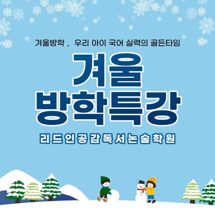 겨울방학, 우리 아이 국어 실력의 골든타임 겨울방학은 아이들이 가장 크게 성장할 수 있는 시기입니다. 특히 국어는 ‘지금 어느 단계에 있는가’가 학년 이후의 학습 이해에 큰 영향을 줍니다. 읽기, 이해, 생각, 글쓰기. 이 네 가지가 함께 자라야 학교 수업도 수월해지고, 스스로 공부하는 힘도 커지죠. 리드인 공감 학원에서는 아이들의 학년·독서 수준에 꼭 맞춘 3단계 겨울방학 특강 프로그램을 준비했습니다. 우리 아이에게 어떤 수업이 맞는지 읽어보세요! 1. 문해력 스타트 반 정확하게 읽고, 내 생각 쓰기 예비 초1 아이들은 막 문자를 읽기 시작했지만, 이해는 아직 '듣기'가 중심입니다. 그래서 이때는 아이의 귀를 통해....... <img src="https://blogthumb.pstatic.net/MjAyNTEyMDFfMTEz/MDAxNzY0NTYzMjgzNjM4.O9omVLKbnk7-HBP4bjmIRvOI0kP0fUCQgr4p8h7o6kQg.v7Vux1Kx0BHUamS5A8r7D2cs8i-RZitO9F8eQxdRxEAg.JPEG/%C1%A6%B8%F1%C0%BB_%C0%D4%B7%C2%C7%D8%C1%D6%BC%BC%BF%E4._%287%29.jpg?type=s3" />
