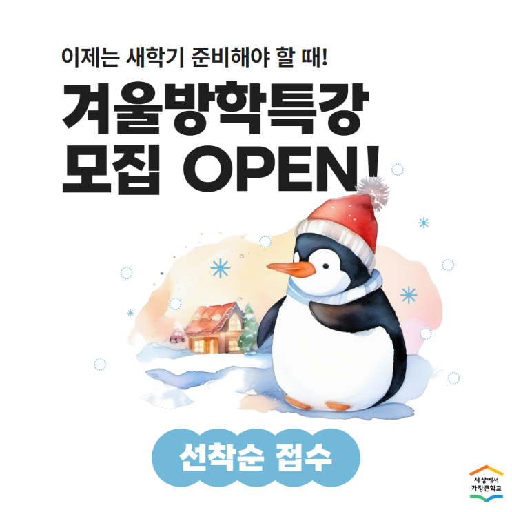 겨울방학은 쉬어가는 시간이 아니라 학년 복습과 새 학기 미리보기 학습계획을 세우는 기간 입니다.! 방학 동안 가장 빠르게 성장하는 시기! 학기 중 놓쳤던 부분을 보완하고, 다음 학년을 대비할 수 있도록 초등,중등 전 과목 방학특강을 개설합니다. 국어특강 :방학 때 꼭 끝내야 할 글쓰기,독해프로그램,어휘력반,일기쓰기반, 중등필수국어반, 초.중등기본문법,심화반,창의독서반,중등사탐반,초등사회반(예비3학년반),예비초5학년 한국사반,한자급수반 영어특강 :핵심만 쏙쏙! 영어리스닝반(초.중등 듣기평가 훈련 리스닝반),리딩반,영어독해반, 영어문법(기초반 ,선행반) ,알파벳,파닉스반, 원서읽기반 수학특강 :방학때 꼭....... <img src="https://blogthumb.pstatic.net/MjAyNTEyMDVfMTY1/MDAxNzY0OTI2MTM4Mjkz.YYCWrYvyg6mrFBhpC-nf00arNtarz0qjCbYKQiag-Bsg.kHdRCvQEglLxn5QXzi1VwkHjxNdQOybysuVljSQzF_wg.PNG/img_%281%29.png?type=s3" />