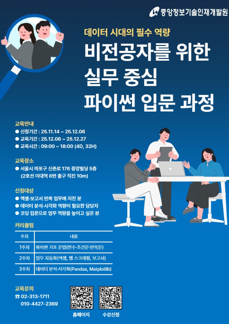 안녕하세요. 파이썬 기초 교육 전문 중앙정보기술인재개발원입니다. 요즘 업무 자동화와 데이터 분석이 필수 역량으로 떠오르면서 많은 직장인분들이 파이썬 기초 교육을 찾고 계시죠. 이런 분들을 위해, 비전공자도 쉽게 따라올 수 있는 실무 중심 파이썬 기초 교육 과정을 개설했습니다. 왜 지금 ' 파이썬 기초 교육'이 필요할까요? 업무 효율은 높이고 싶은데, 엑셀만으로는 한계가 느껴지시나요? 파이썬 기초 교육을 통해 반복적인 보고서 작업, 데이터 정리, 웹 스크래핑 등을 자동화할 수 있습니다. "엑셀 반복 업무에서 해방감을 느꼈어요" "코딩이 이렇게 업무에 바로 쓰일 줄 몰랐습니다." 실제 수강생들....... <img src="https://blogthumb.pstatic.net/MjAyNTExMjFfMjgg/MDAxNzYzNzA0OTAzODIx.Xax1M7_zXXjo1f9UyNiT3T-FunXLXveLnlR48KCYXD0g.ewqUo9GxBB52Xv3g03SuuYn9Mpo9_L69RAdeYJPK9Uwg.JPEG/%C6%C4%C0%CC%BD%E3_%C6%F7%BD%BA%C5%CD.jpg?type=s3" />
