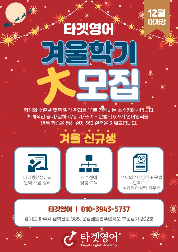 안녕하세요 타겟영어 입니다. 2025년의 마지막 12월을 앞두고 겨울학기 신규생을 모집합니다. 영어의 실력은 '기초 > 개념 > 적용' 의 흐름이 중요합니다. 타겟영어는 학생 개개인의 레벨을 분석하여, 1:1 맞춤 지도와 그룹지도, 단계별 학습으로 실력의 변화를 만들어 냅니다. 2026년 신학기를 위한 겨울학기 대비 타겟영어는 단단하고 튼튼한 영어의 기본을 만들어 갑니다. *문의 및 상담* 010-3943-5737 경기도 파주시 심학산로 385, 운정센트럴푸르지오 후문상가 202호 신고 제 1182호 / 타겟영어교습소 / 교습과목 영어 : 초등 주 2회: 10만, 주 2회 or 3회 25 만 #산내초 #운정푸르지오아파트 #운정영어 #목동동영어학원 #....... <img src="https://blogthumb.pstatic.net/MjAyNTExMjZfMTA3/MDAxNzY0MTM5ODY2NjUx.gWVAYdaZk0Eipk6A13oBq5AUswcdwXNKfygUBlgx8jQg.VUQDddUS1bHo7PUWwFOE-jcOU7tdvGEpGqvVCDmkRasg.JPEG/%C1%A6%B8%F1%C0%BB-%C0%D4%B7%C2%C7%D8%C1%D6%BC%BC%BF%E4_-001_%2828%29.jpg?type=s3" />