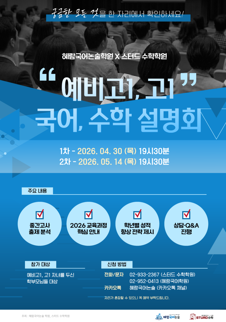 안녕하세요? 혜람국어논술학원입니다. 중간고사 기간이라 모두들 바쁜 하루를 보내고 계실 것 같아요. 시험 이후 아이들 학습과 관련된 여러가지 의문점이 많이 생기실 거 같아서 조금이라도 정보를 얻는데 도움이 되고자 설명회를 준비했습니다. 국어 설명은 저희가 하구요, 수학은 특별히 스터드 수학학원 원장님이 참여하시기로 했습니다^^ 설명회는 총 2회로 나누어 진행합니다. 날짜는 4월 30일 목요일과 5월 14일 목요일로, 편한 날짜로 선택해서 참여해 주시면 됩니다. 직장 다니시는 분들을 위해 시간을 조금 늦게 계획했으니 퇴근 후 7시30분까지 편하게 오십시오. 재원생 신규생 모두 참여 가능합니다. 다른 어떤 시기보다 장기적인 관....... <img src="https://blogthumb.pstatic.net/MjAyNjA0MTZfMTMy/MDAxNzc2MzAyMzM5ODMw.l_EoR6m0fkzTowhEDpeBfDxoAa9DWUlS5fTnkQA7jesg.VQHWkkbzKlNERG4su4654ShIVo4DzZlZQ1uGp3gNE4sg.PNG/%BC%B3%B8%ED%C8%B8_%C8%AB%BA%B8.png?type=s3" />