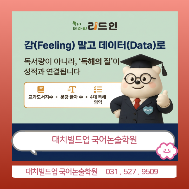 안녕하세요~ 대치빌드업 국어논술학원입니다. 대치빌드업 국어논술학원 초중독서논술 리드인 독서논술은 변화된 학습 환경과 입시제도를 잘 반영하여 우리 아이들의 학습적인 면과 정서적인 면까지 충족시켜 줄 수 있습니다. 수능국어 1등급을 많이 배출하고 배출하고 있는 제가 우리 아이들의 현재뿐만 아니라 미래를 보고 함께 합니다. 우리 아이 책을 제대로 읽고 있나요? 학년이 아닌 우리 아이의 글 읽기 능력에 맞게 책을 읽습니다. 미국의 렉사일 독해력 측정 기준이 있다면 리드인은 교과도서지수로 우리 아이의 읽기 수준을 확인합니다. 내용을 이해하는지 내용을 이해하는데 시간이 너무 오래 걸리지는 않는지 글에 나타난 정보만 이해....... <img src="https://blogthumb.pstatic.net/MjAyNjA0MjFfMjM1/MDAxNzc2NzM2MzM3MjE4.3ZDsO5oZB768YMMfrIooUDy6rg-LhZEyafwHFsNL3VMg.a8if70RV90LsvT-_WJ1h92xKv5zkh6LGMlihkIOvUZUg.PNG/%C1%A6%B8%F1%C0%BB_%C0%D4%B7%C2%C7%D8%C1%D6%BC%BC%BF%E4._%2812%29.png?type=s3" />