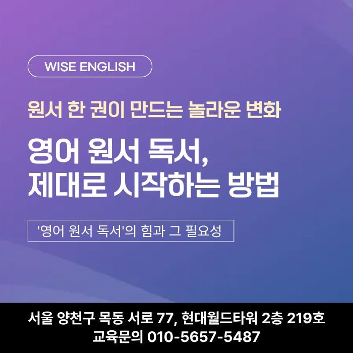 안녕하세요. 양천구 목동에 위치한 와이즈영어는 단순한 문제 풀이가 아니라, 학생 눈높이에 맞춘 맞춤 지도와 이해 중심 수업으로 차근차근 실력을 쌓아가며, 영어에 대한 자신감과 흥미를 함께 키울 수 있는 환경을 만들어 줍니다. 영어 학습의 파도 속에서 우리 아이들에게 가장 필요한 나침반은 무엇일까요? 오늘은 많은 학부모님이 궁금해하시는 '영어 원서 독서'의 필요성에 대해 깊이 있게 다루어보려고 합니다. 영어 원서 독서, 부담은 내려놓고 즐거움부터 채우세요 많은 학생이 '영어 책'이라고 하면 두꺼운 단어장이나 딱딱한 교과서를 먼저 떠올리며 부담부터 갖곤 합니다. 하지만 영어 공부의 핵심은 영어를 공....... <img src="https://blogthumb.pstatic.net/MjAyNjA0MTVfMjIw/MDAxNzc2MjE3NzkxMTkz.x1pRW7RMRIvyu32Nty81BNXTbluXVF_0pB_9sY4Yc4Ig.vHURksohd_zY5uRa8-oTDGHT5SiPbbe7muPw1fenSh8g.JPEG/%B8%F15%B5%BF%BF%B5%BE%EE%C3%DF%C3%B5_%281%29.jpg?type=s3" />