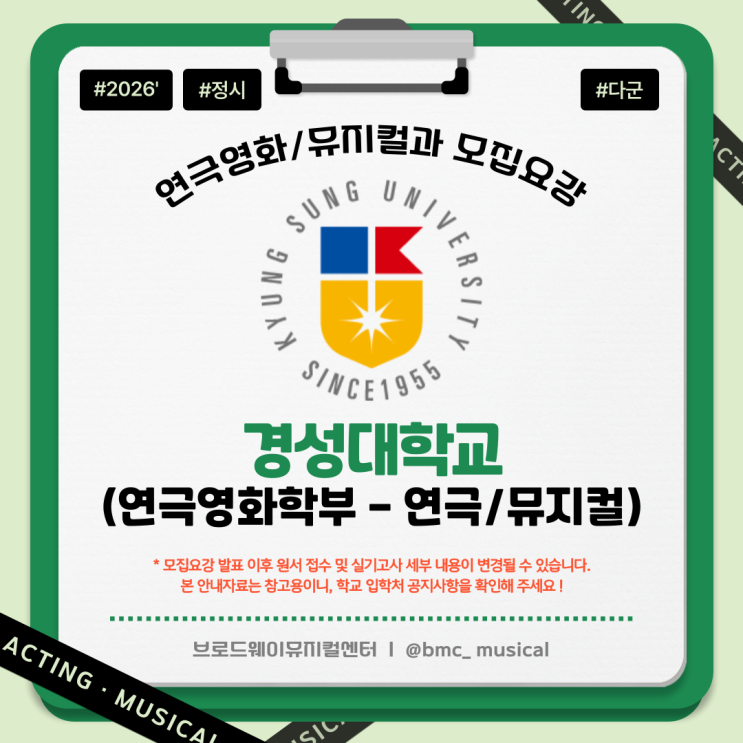 2026학년도 연극영화과 / 뮤지컬과 정시 모집요강 <다군> 정시 실기시험이 얼마남지 않았습니다. 마지막까지 준비해온 만큼, 모두 좋은 결과가 있기를 바랍니다. 경성대학교 연극영화학부 연극/뮤지컬전공 정시 모집요강 극동대학교 연극연기학과 정시 모집요강 대진대학교 연기예술학과 정시 모집요강 동양대학교 공연영상학부 공연예술전공 정시 모집요강 명지대학교 뮤지컬공연전공 정시 모집요강 서경대학교 공연예술학부 연기전공 정시모집요강 순천향대학교 공연영상학과 연기전공 정시 모집요강 안양대학교 공연예술학과 정시 모집요강 예원예술대학교 공연예술학과 정시 모집요강 인천대학교 공연예술학과 정시 모집요강 인하대학....... <img src="https://blogthumb.pstatic.net/MjAyNTEyMTNfMTY4/MDAxNzY1NTk1NTE2NzQ4.12O1ndi1KscGKF8MKup_ymyorMjTdjCkQwRw0qFqdHMg.2xmeU8FfZ4rDVqLnbEN41IYJzefVPt2xPCz9VsBZGYMg.PNG/%B0%E6%BC%BA1.png?type=s3" />