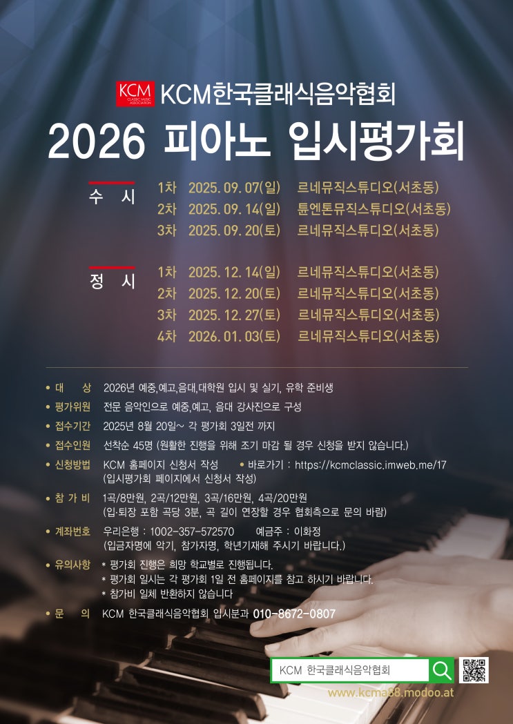 2026 KCM 피아노 입시평가회 요강 ★ 정 시 1차: 12월 14일(일)르네뮤직스튜디오(서초동) 2차: 12월20일(토)르네뮤직스튜디오(서초동) 3차: 12월27일(토)르네뮤직스튜디오(서초동) 4차: 01월03일(토)르네뮤직스튜디오(서초동) ㅣ대 상 : 2026년 예중,예고,음대,대학원 입시 및 실기, 유학 준비생 ㅣ특 전 : 개인평가서 제공.지망학교별 평가 ㅣ평가위원 : 전문 음악인으로 예중,예고, 음대 강사진으로 구성. ㅣ접수마감 : 2025년 8월 20일~ 각 평가회 3일전 까지 ㅣ접수인원 : 선착순 45명 (원활한 진행을 위해 조기 마감 될 경우 신청 받지 않음.) ㅣ신청방법 : KCM 홈페이지 신청서 작성 (입시평가회 페이지 신청서 작성) ㅣ참 가 비 : 1곡 8만....... <img src="https://blogthumb.pstatic.net/MjAyNTEyMDhfMjcy/MDAxNzY1MTc5MTY2Nzc4.rjhzm25QQ2a6m0ZlMiRaRqFOGcCa6fEmkKynfoYi8tgg.Rl2T3_5k_MGbhSB570jBVA6IUrTv6oZFNpexxuOCwjog.JPEG/2026%C0%D4%BD%C3%C6%F2%B0%A1%C8%B8.jpg?type=s3" />