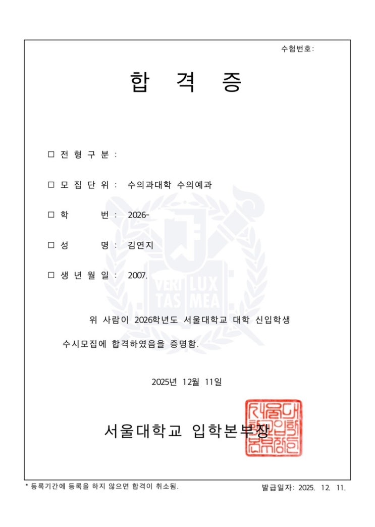 서울대학교 수의예과 수시 합격!! 3년 연속 수강 포곡고3 김0지 성실하고 바른 태도로 3년 연속 수강하며 목표를 향해 나아간 훌륭한 학생!! 합격을 축하합니다 <img src="https://blogthumb.pstatic.net/MjAyNTEyMTJfMjA5/MDAxNzY1NDY3ODAzMzQ5.qRjPCrDkmB91PIvmygkBf_j1ziosqo_X15Oj_6xYTtsg.lDdfYdEdHxnGPrXy6Egk5Bwxt8mXCaEeL0f0ctai06Eg.JPEG/output%A3%DF224772347.jpg?type=s3" />