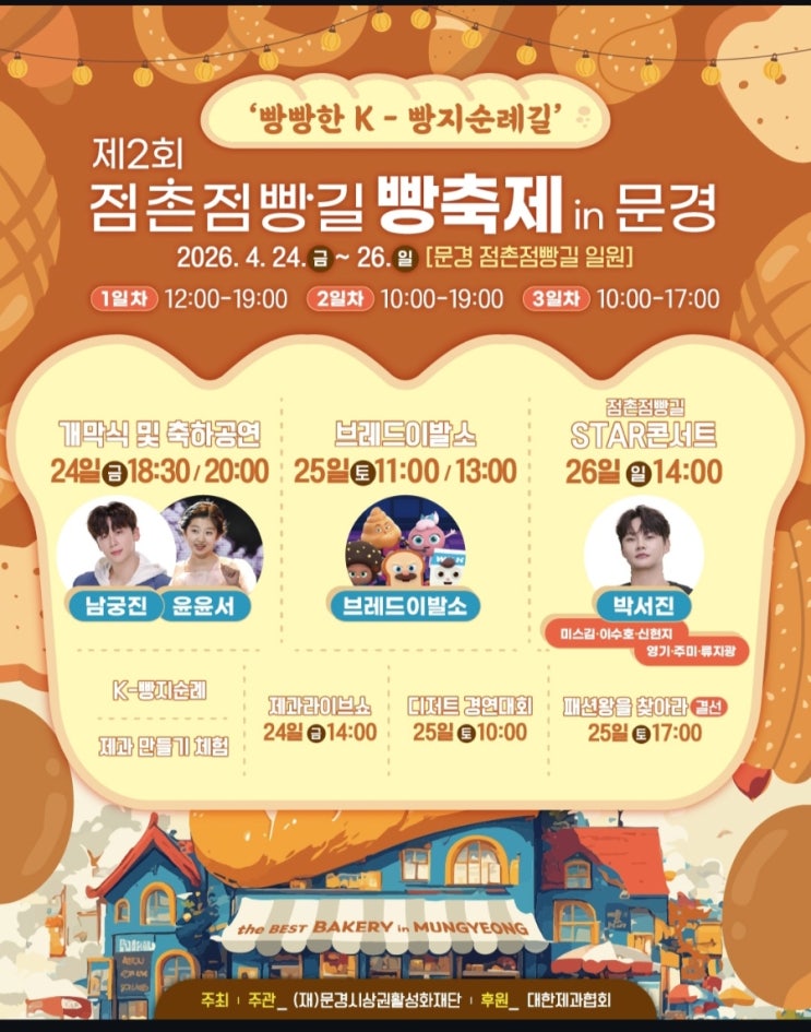 달콤한 빵 향기로 가득한 봄날, 경북 문경에서 특별한 축제가 열립니다 ✨ 제2회 점촌점빵길 빵축제는 먹고, 보고, 즐기고, 또 먹는(!) 빵 덕후들을 위한 완벽한 3일간의 힐링 축제입니다 빵순이·빵돌이 성지, 점촌점빵길! 점촌점빵길 빵축제는 이름 그대로 빵으로 시작해 빵으로 끝나는 이색 테마형 거리 축제인데요! 거리 곳곳에서 퍼지는 고소한 빵 향기와 갓 구워낸 따끈한 빵들을 직접 맛볼 수 있어 오감이 행복해지는 시간이에요 눈과 귀까지 즐거운 공연 라인업 이번 축제는 공연도 정말 빵빵합니다! 개막 축하공연에는 장혜진 남궁진 윤윤서 이재희 그리고 축제의 하이라이트! STAR 콘서트에서는 박서진 류지광....... <img src="https://blogthumb.pstatic.net/MjAyNjA0MTlfMTI2/MDAxNzc2NTUwOTkzMjA4.VwlJeEXSkK4Y7N8MEkYE3vvGSnjE7uNE8A0HdZwiDWEg.Im36dded6uN4WtEDtmHd5OdX2aZF3FM754M_5O1bkqsg.JPEG/900_Screenshot_20260419_072123_Instagram.jpg?type=s3" />