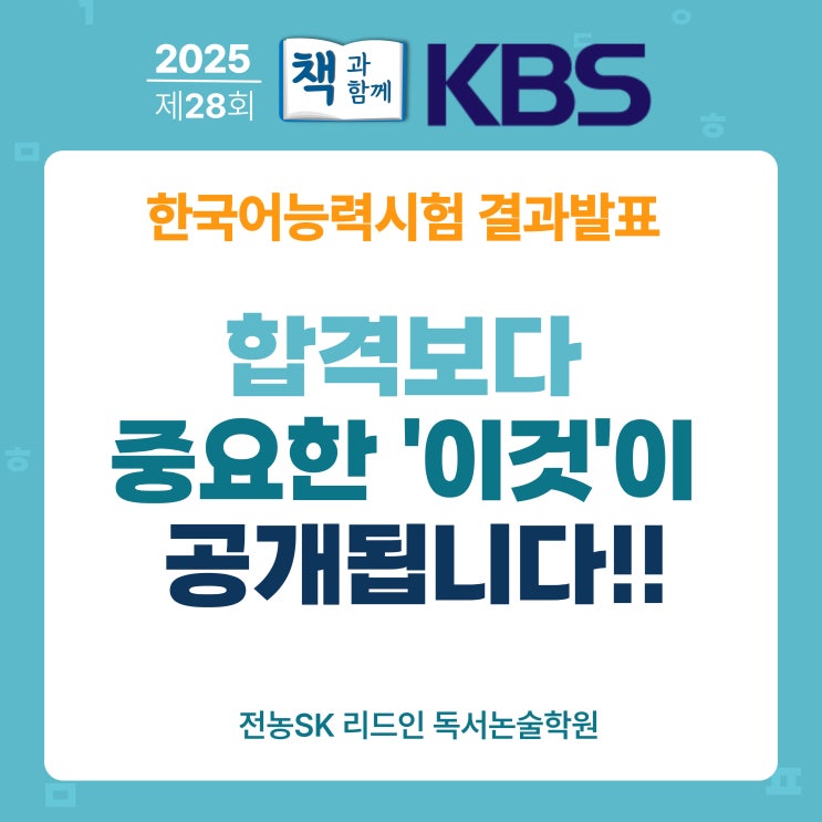 한 걸음 더 성장한 우리 아이들_전농 SK 리드인 안녕하세요. 전농 SK 리드인 독서논술 학원입니다. 지난 25년 11월 1일에 치러진 제28회 책과 함께 KBS 한국어 능력시험의 결과가 어제 발표되었습니다. 이번 시험의 진정한 의미는 학생들의 성장 과정을 확인하는 계기였답니다. 그동안 열심히 준비했던 전농SK 리드인 아이들의 학습 과정과 앞으로의 계획 안내합니다. 우리 아이들은 각자의 학습 속도에 맞춰 시험을 준비해왔습니다. 독해력 향상을 위해 지정된 분량의 독서를 반복해 읽고, 내용을 깊이 있게 분석하며 취약점을 보완하는 데 집중했습니다. 동일한 지문을 여러 차례 재독하며 핵심 내용을 파악하고, 모르는 어휘는 별도로 정....... <img src="https://blogthumb.pstatic.net/MjAyNTEyMTFfMzMg/MDAxNzY1NDU3MjE0NjE0.TY0Uh2XX3s0MOwqLUnYmgKiZ2GVdxl0ohllg3ODhu9gg.IR50Efw4OPkbWlZm4vf2iY87k6VtIW-4vNU9tLndQd8g.JPEG/%B9%E6%C7%D0%C6%AF%B0%AD%B9%E8%B3%CA-001_%282%29.jpg?type=s3" />