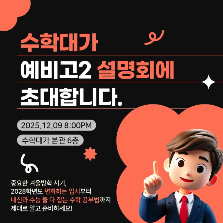 안녕하세요. 중고등학생을 위한 수학 학습 로드맵을 제시하는 곳 수지에 위치한 수학대가 수지캠퍼스입니다. 최근 많은 학부모님께서 문의주셨던 수학대가 예비고2 겨울 학습설명회가 오는 12/9(화) 저녁 8시에 진행됩니다. 많은 학부모님의 관심과 참석 부탁드립니다. 감사합니다. 설명회 참석 신청 및 궁금하신 사항은 아래 번호로 연락바랍니다. 896-8960 ↓ ↓ ↓ ↓ ↓ 바로 전화연결하기 <img src="https://blogthumb.pstatic.net/MjAyNTEyMDRfMTkg/MDAxNzY0ODQyMzQ0MjEx.iENHSO8N_GakU21FwC22O-vHbijBZgv7_iirr48xfOQg.pjKnZnq1x0cvlanEJfU6Aq3aTckxLZco180wJop_ua4g.JPEG/%C1%A6%B8%F1%C0%BB_%C0%D4%B7%C2%C7%D8%C1%D6%BC%BC%BF%E4..jpg?type=s3" />