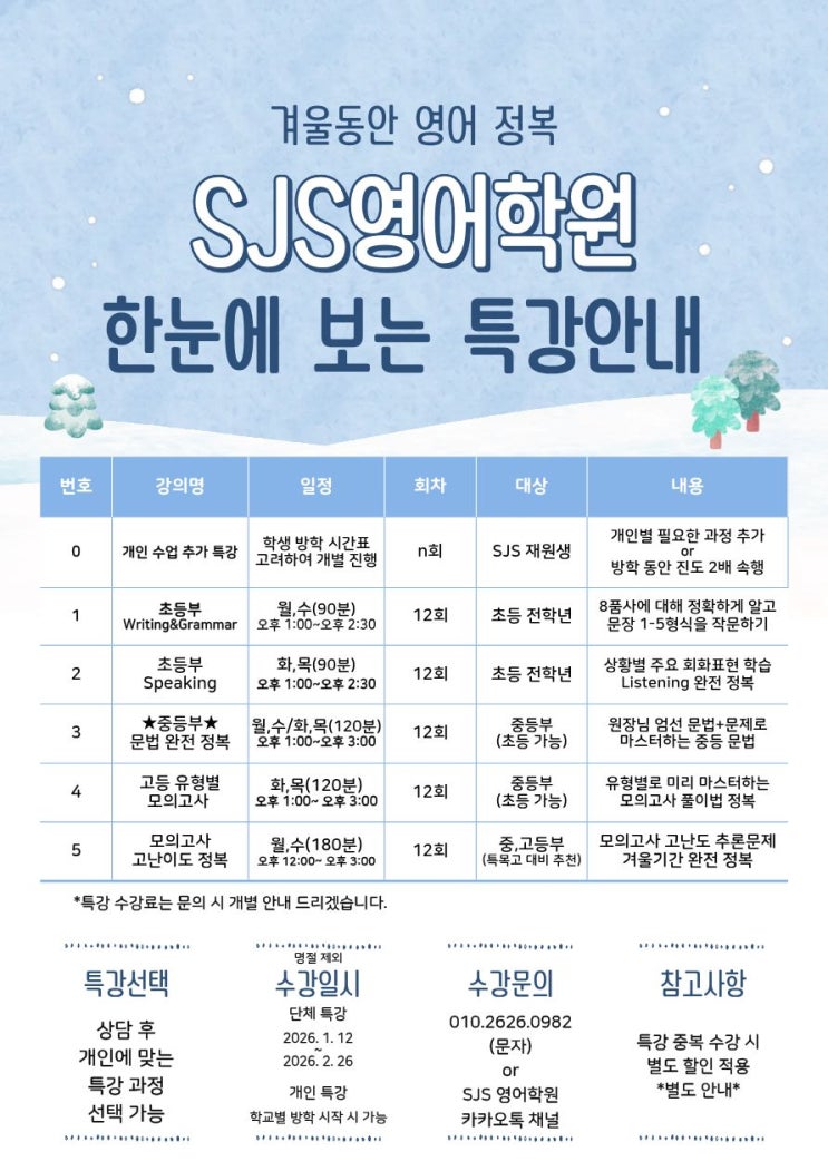 상현동 SJS 영어학원 2026 겨울방학 특강 Program 안내