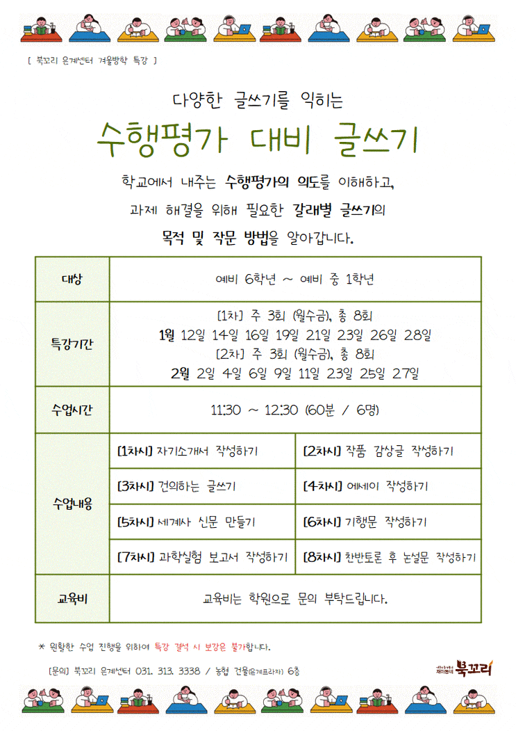 안녕하세요♥ 독서부터 글쓰기까지!! 은계지구 독서논술 학원 북꼬리 은계센터입니다. 이제 추워진다 했더니 어느 새 12월이 되었네요. 아이들의 2학기도 이제 절반을 지나 이제 곧 겨울방학입니다. 잠시 숨 고르는 여름방학과 달리 겨울방학은 새학년을 맞이하는 특별한 시간을 준비하고 계실텐데요. 아이들의 특별한 겨울방학을 위해 북꼬리 은계센터에서 겨울방학 특강을 준비했습니다! [나만의 이야기로 채우는 책 만들기] 주제선정부터 이야기 구성까지 직접 책을 만드는 과정을 경험하며 자신의 이야기를 책으로 완성해 성취감을 느끼고 책의 새로운 즐거움을 만나게 됩니다. [N.I.E 신문 활용 수업] 비문학을 어려워하는 친구들에게 한줄....... <img src="https://blogthumb.pstatic.net/MjAyNTEyMTBfOTcg/MDAxNzY1MzQxODI5OTY0.UgLK-1c4vSAJeKO3vrA-nJQosmpqFO_d8oPpkqfSHb4g.iaIbeKAUsmBgtvSDCqj0TGA8o6Q8cI9UK3yocT-5aFog.GIF/gva000024200007.gif?type=s3" />