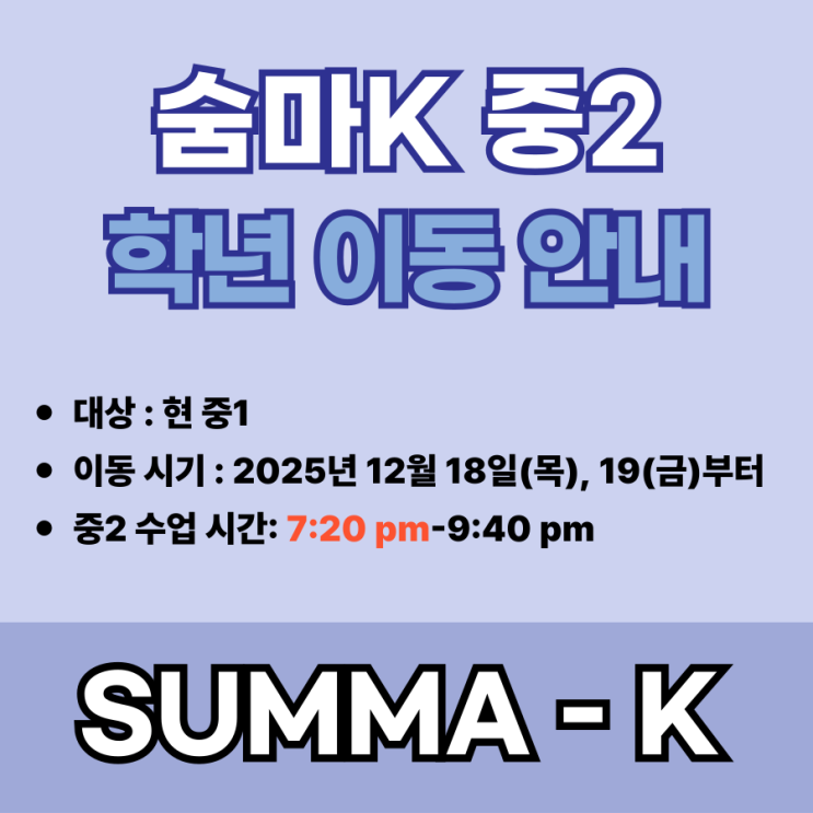 안녕하십니까, 숨마K원 입니다! 12/18(목) ~ 12/19(금) 부터 현 중1 학생들은 중2로 이동하게 됩니다. ( ・ᴗ・ `ྀི) 학년 이동 안내문 연간계획서 같이 첨부해서 올려드립니다! 꼼꼼하게 읽어보시고, 각자의 목표를 가지고 끝까지 함께해봅시다! <img src="https://blogthumb.pstatic.net/MjAyNTEyMDlfNjIg/MDAxNzY1MjY2Njc2NTUz.OQ4ntb_rWSJI8P7CHdnk5IClWhGkvOnQA5cIMotXHnEg.ipc1HLbD0fPYIb7a3hRhyWLjv_3tEMKuFd-fK4CcRcsg.PNG/%C1%A6%B8%F1%C0%BB-%C0%D4%B7%C2%C7%D8%C1%D6%BC%BC%BF%E4__%BA%B9%BB%E7%BA%BB-_2_-001_%281%29.png?type=s3" />