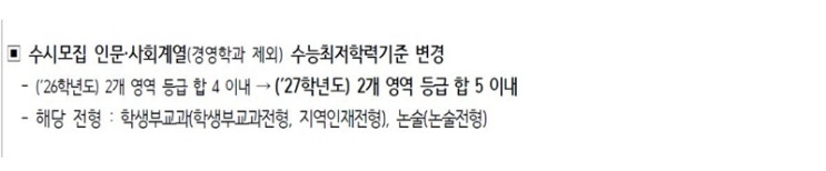 2027 부산대학교 수시전형 지역거점 대학교의 자부심 부산대학교는 매해 수시모집요강에 변화를 주기 때문에 당해 수험을 앞둔 수험생들의 각별한 모집요강 정독이 필요합니다. 가장 주목할 부분은 인문/사회계열 수능최저 학력기준 완화입니다. 당해 전까지 부산대의 인문/사회계열 최저 학력기준은 2합 4로서 2개의 최저과목을 요구하는 수도권 소재의 대학들과 비교 하여도 상당히 높은 수준이었습니다. [ 예시 : 지역균형 = 경희대 2합5, 국민대 2합6, 이화여대 2합5 등 ] 이와 같은 높은 최저 요구 치에 더불어 불수능의 여파로 근 2~3년간 낮은 최저충족률을 보였습니다. 인문/사회 계열의 최저완화 [ 2합 5 (탐구1) ] 는 중요한 변곡....... <img src="https://blogthumb.pstatic.net/MjAyNTEyMTBfMjc3/MDAxNzY1MzU3ODU1OTk0.OK5v654AAmMY1ggeckFm2bXBREWA3IziX2rPKsQWLFEg.PqZWBnmBzQ_MuxqP0LZWVAlmwxJplZ7GKvAjghuCNi0g.JPEG/IMG_2255.jpeg?type=s3" />