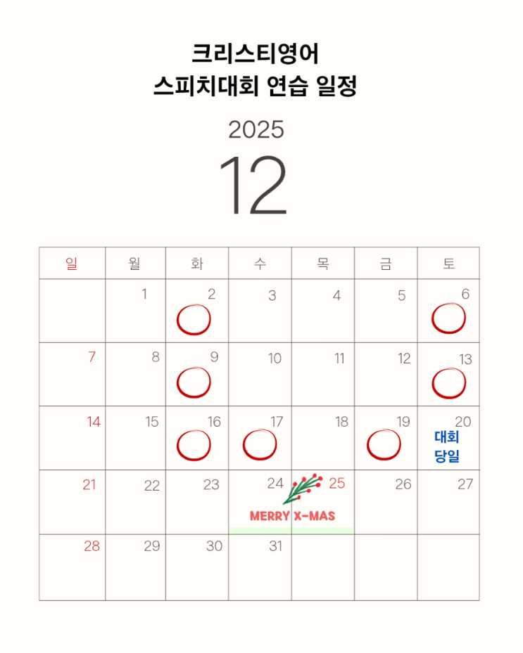안녕하세요! 크리쌤입니다. 12월 국제영어말하기대회가 이제 3주 남짓 남았어요! 얼마 남지 않았으니 끝까지 열심히 해요!! 스피치 대회 프렙반 12월 연습 일정 ➰️화요일 저녁 6시 30분 ➰️토요일 오후 1시 30분 ➰️12월17일 수요일 7시 30분 ➰️최종 리허설 12월 19일 금요일 저녁 7시 30분! 연습 일정 참고해주세요^^ 올 해 마지막 스피치 연습 일정입니다~ 연습에 빠짐 없이 나와서 열심히 연습해봅시다!! 감사합니다! #크리스티영어 #내발산동초중등영어교습소 #내발산동영어스피치준비반 #발산역초중등영어 #가곡초등학교 #우장산힐스테이트아파트영어 #우장산힐스테이트아파트 #내발산동초중등영어 <img src="https://blogthumb.pstatic.net/MjAyNTExMjhfOSAg/MDAxNzY0MzQxNTA4OTM1.l3IGpNNBpT_f1rSVTKt77PAS9N0Xk8RggWJxUk62S3Ig.Ixg2kbaU-VTecGqH2p6EKqz1Ub0J3yq0302QA8l6Hw0g.PNG/900%A3%DF%C8%AD%C0%CC%C6%AE_%BD%C9%C7%C3_%C4%B6%B8%B0%B4%F5_%C0%CE%BD%BA%C5%B8%B1%D7%B7%A5_%B0%D4%BD%C3%B9%B0%A3%A84%A3%DF5%A3%A9%A3%DF20251124%A3%DF232145%A3%DF0000.png?type=s3" />