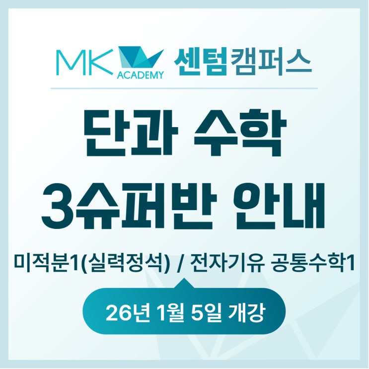 부산 센텀수학학원 MK아카데미 2026년 1월 개강 수학 단과 3슈퍼반 안내 MK 아카데미 센텀점에서 1월에 새롭게 시작되는 3슈퍼반 수학 단과 프로그램을 소개드립니다. 이번 수업은 주 2회 운영되는 집중형 프로그램입니다. 이번 과정은 1월 5일(월)부터 시작되며, 모든 수업은 MK 아카데미 센텀캠퍼스에서 진행됩니다. ■ 3슈퍼반의 학습 특징 데일리·위클리 테스트 운영 테스트 후 성적표를 발송하여 학습 현황을 정확하게 점검합니다. 필요한 학생에게는 별도 보완 지도로 학습 빈틈을 줄입니다. 라이프코치 기반 학습 플래너 관리 학생 스스로 계획을 세우고 실행하도록 유도하여 자기주도 학습 습관을 형성합니다. 모의고사 및 전국단위 지표....... <img src="https://blogthumb.pstatic.net/MjAyNTEyMDhfMjc5/MDAxNzY1MTcyMDA2MjQz.Qg5vBA9jYe9of5-h9KseL65c_sL_k-gmLL29aFuLGK4g.rszSLRpuQV9u1MQAtsvkI4CS2xitrcVZBTBuyTI0_F8g.JPEG/%BA%B9%BB%E7%BA%BB_%BA%B9%BB%E7%BA%BB_%BC%BE%C5%D2%C4%B7%C6%DB%BD%BA_-_2025-12-08T143320.530.jpg?type=s3" />