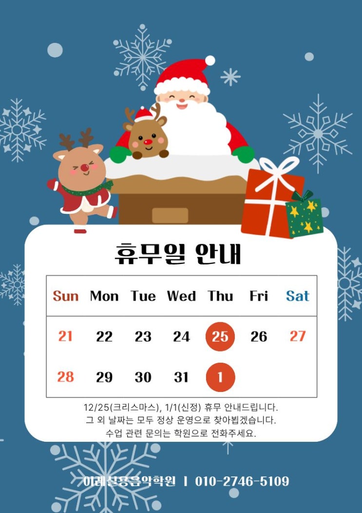 안녕하세요, 이레 실용음악학원입니다. 12월 25일(수크리스마스)과 1월 1일(신정)은 학원 휴무입니다. 한 해 동안 함께해 주셔서 진심으로 감사드리며, 사랑하는 분들과 즐거운 크리스마스 보내시고 행복한 새해 맞이하시길 바랍니다. 감사합니다. <img src="https://blogthumb.pstatic.net/MjAyNTEyMThfMjgy/MDAxNzY2MDM5MjU2Mzgy.a6j_hi4yzWy0K4lSgEVArukF78Aq0273ggKmH2BfrVQg.GL9YvDthDLYIv8AeXEUvrpUbEfsb22jQO2FwDnm3rFkg.JPEG/%C5%A9%B8%AE%BD%BA%B8%B6%BD%BA%2C%BD%C5%C1%A4_%C8%DE%B9%AB.jpg?type=s3" />