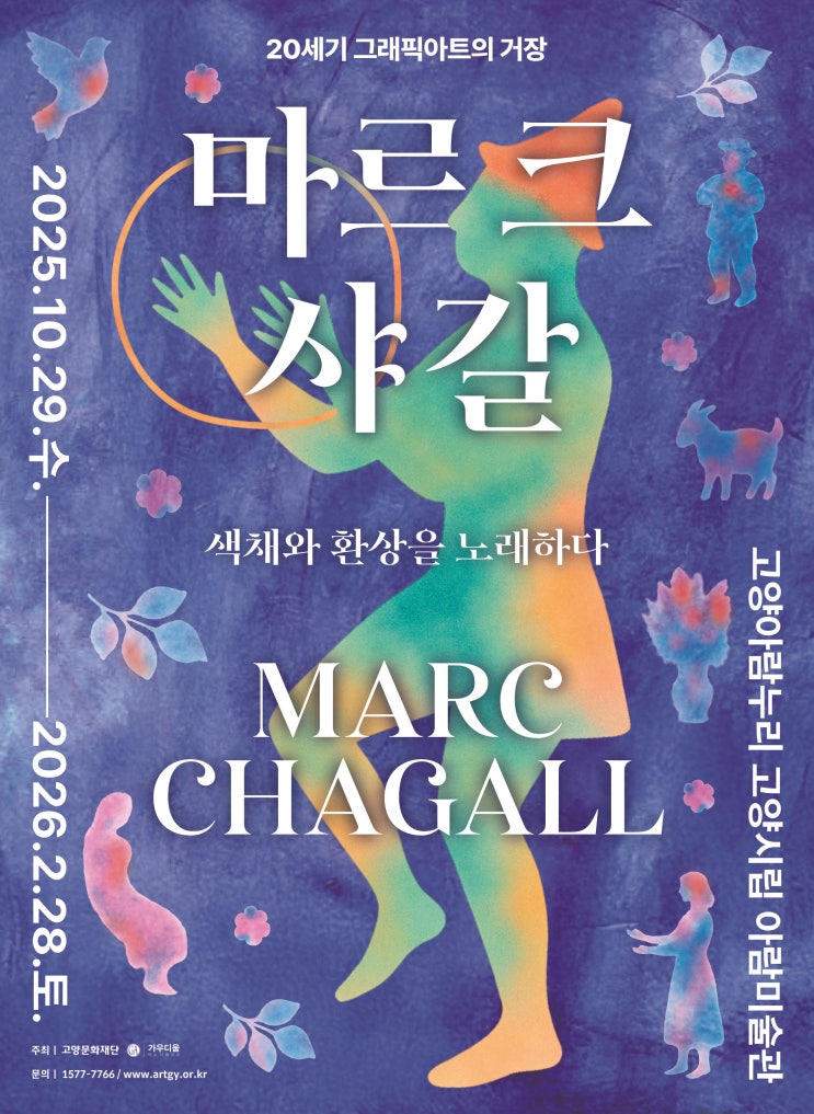 예술이란 사랑의 표현이다. 만약 그렇지 않다면 그것을 아무것도 아니게 된다. 안녕하세요! 백석역미술학원 창조의아침 백마캠퍼스입니다. 오늘 백석역 미술학원 백마창아에서 소개해 드릴 전시는 <마르크 샤갈 : 색채와 환상을 노래하다> 소식입니다. 마르크 샤갈 : 색채와 환상을 노래하다 [마르크 샤갈 : 색채와 환상을 노래하다] 전시 기간 2025년 10월 29일(수) ` 2026년 2월 28일(토) * 휴관 매주 월요일, 추석 당일, 1월 1일 전시시간 화~일 오전 10:00~18:00 (입장마감 17:00) 전시장소 고양아람누리 고양시립 아람미술관 전시문의 1577-7766 관람요금 [마르크 샤갈] 1887년 벨라루스 비테프스크의 유대인 마을에서 태어나 배....... <img src="https://blogthumb.pstatic.net/MjAyNTExMjRfNTUg/MDAxNzYzOTU2NTUwNzg2.SY_64gQel5pXflK0XpAo63ULL6aNk-m-nTWpKv9WpDog.3srVwt8_MQ6kVKJyWEvJi-rK7JLONxqXgH6iBp0eMVAg.JPEG/%B9%E9%B8%B6%C3%A2%BE%C6_%B8%B6%B8%A3%C5%A9%BB%FE%B0%A520%BC%BC%B1%E2%B1%D7%B7%A1%C7%C8%BE%C6%C6%AE%C0%C7%B0%C5%C0%E5%C8%AF%BB%F3%B0%FA%BB%F6%C3%A4%B8%A6%B3%EB%B7%A1%C7%CF%B4%D9%C0%FC%BD%C3%C8%B8_01.jpg?type=s3" />