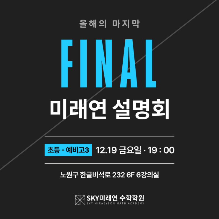 엄마들이 잘 못 알고 있는 수학 학습법 냉정하게 사실만 말해드립니다. 초등입학설명회는 사전예약이 필수입니다! 📍 초등입학설명회 12월 매주 화, 토 화 : 오전 10시 / 토 : 오후 3시 대상 : 초 4,5,6학년 학부모 사전예약 : 02-416-3355