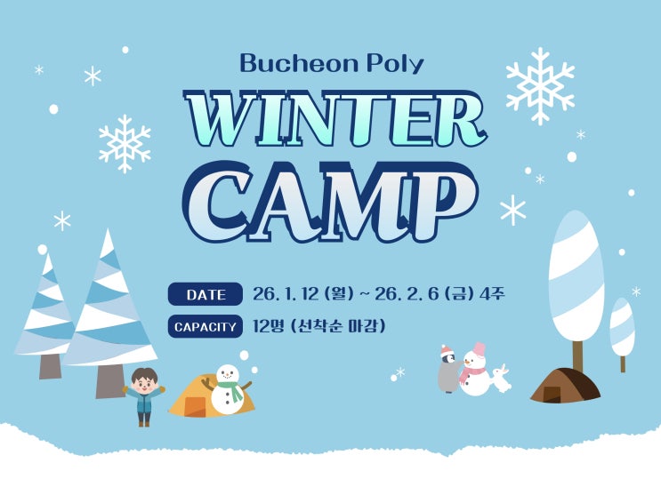 안녕하세요~ 부천 폴리 겨울 방학 캠프 안내 드립니다. ❄️일정 : 26/1/12 (월) ~ 26/2/6 (금) 4주 ❄️정원 : 12명 (선착순 마감) 기타 문의 사항은 032) 322-7659 로 부탁드립니다. 감사합니다. <img src="https://blogthumb.pstatic.net/MjAyNTEyMThfMTk0/MDAxNzY2MDMzNzc1NjQ2.I1OcSE3SFNHo_mXyrh80pxinb7Qd-cNWeLhgV0Cr9-0g.WHuk6jUJTJpDjxPWUzrAscRX1T1fXXCMpJCkLcr5yJog.JPEG/%B2%D9%B9%CC%B1%E2%C1%A6%B8%F1%C0%BB-%C0%D4%B7%C2%C7%D8%C1%D6%BC%BC%BF%E4_-001.jpg?type=s3" />