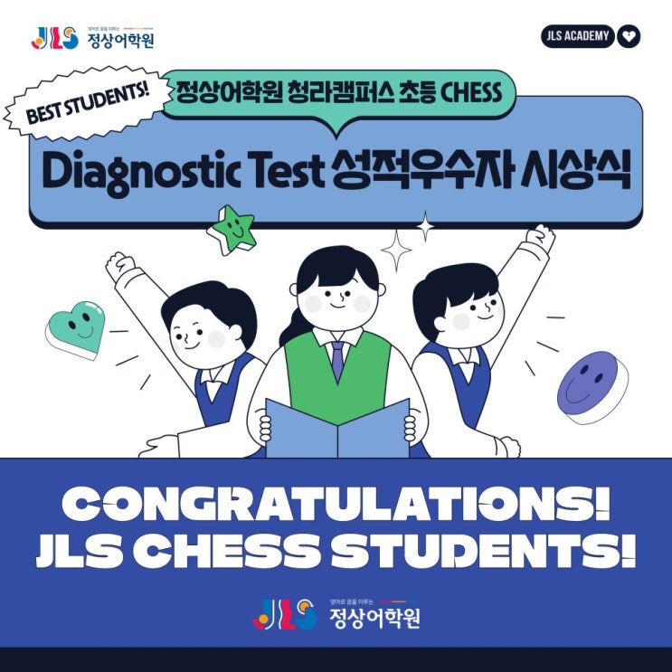 안녕하세요 :) 학부모님 학생 여러분, 정상어학원 청라캠퍼스입니다. 오늘 포스팅할 내용은 2025년 4TH Term 초등학교 CHESS 프로그램 재원생들 중 Diagnostic Test (DT 시험)에서 우수한 성적을 거둔 학생들을 대상으로한 수상식 사진입니다. 청라 캠퍼스에서는 3개월마다 진행되는 레벨테스트에서 100점과 97.5점을 받은 학생들에게 Certificate of Achievement (성적 우수상)을 수여하고 있습니다. 이번에 수상을 못한 친구들은 다음 학기에 열심히 준비해서 꼭 좋은 성적을 거둘 수 있도록 노력해야겠지요!? 정상어학원 초등과정 커리큘럼을 한 단계, 한 단계 성실히 수행해나가며 성장하는 아이들을 보면 큰 뿌듯함과 성취감을 저희 선생님....... <img src="https://blogthumb.pstatic.net/MjAyNTEyMDVfMjIx/MDAxNzY0OTIyMTM3NDI3.EZC2OEqZD5cRL6MCJnVXOVkZfVuTe1AYBmAK3WlSICAg.gHugobZI4x8H0GFrGmJGL47VDu1GO12JvgmXGKcnh3og.JPEG/%C1%A6%B8%F1%C0%BB_%C0%D4%B7%C2%C7%CF%BC%BC%BF%E4_-_2024-12-06T145249.360.jpg?type=s3" />