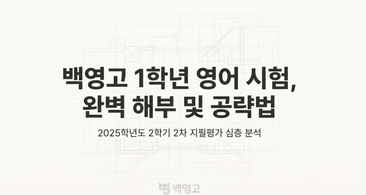 백영고 내신 시험의 특징 2025학년도 백영고등학교 1학년 2학기 2차 지필평가(기말고사) 영어 시험의 발췌문입니다. 시험의 전반적인 난이도와 문제 유형별 출제 경향을 분석해 드릴 수 있습니다. 백영고 1학년 2학기 기말고사 영어 시험의 출제 경향 및 난이도 1. 전반적인 난이도 및 배점 경향 백영고 1학년 2학기 기말고사는 문항별 배점을 3.0점에서 3.8점까지 다양하게 부여하여 난이도에 따른 변별력을 확보하고 있습니다. 특히, 빈칸 추론, 문맥상 낱말의 쓰임(어휘), 그리고 어법 문제 등 고난도 유형에 3.4점, 3.5점, 3.6점, 심지어 3.8점에 이르는 높은 배점을 할당했습니다. 이는 단순한 내용 이해를 넘어 정확한 어법 지식, 깊이 있....... <img src="https://blogthumb.pstatic.net/MjAyNTEyMTNfMTYw/MDAxNzY1NjE5NzU5Mjc1.XOQYKdvLpXouPvI4d9bIqxH58QSVE2BgdtlEWizgprIg.hib8SAhM1YNANJUTtvVrELlx_lOTpvt-C_JFIpgFmhsg.PNG/%EB%B0%B1%ED%91%9C%EC%A7%3F.png?type=s3" />