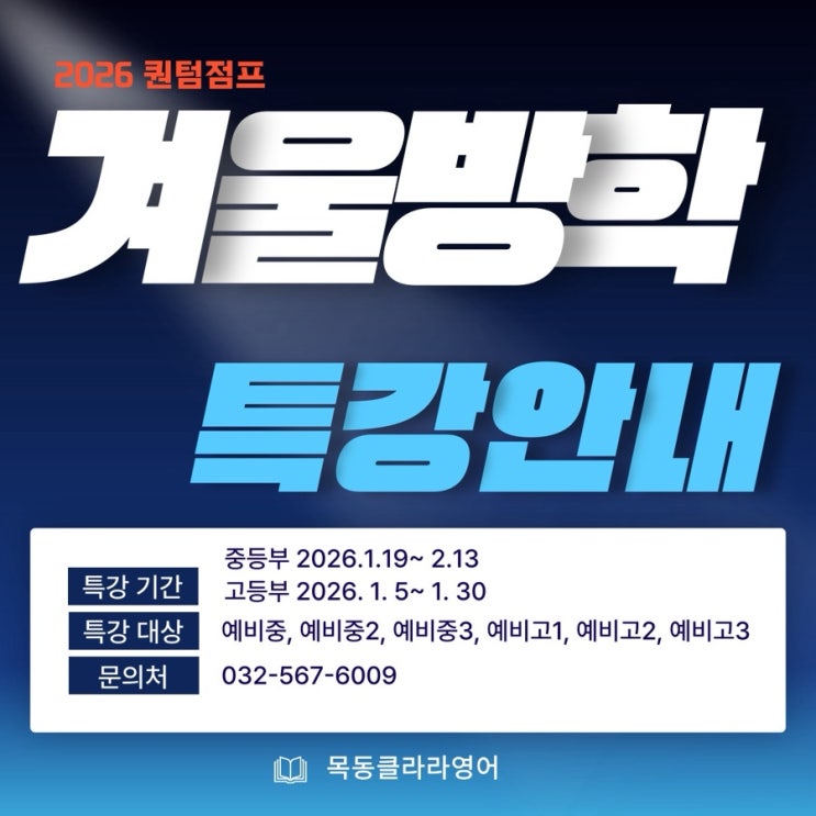 안녕하세요! 2026년 퀀텀점프를 위한 예비 중등, 중2, 중3, 예비고, 고2,고3 학생들을 위한 특강 일정및 과정 안내드립니다! 선착순 마감이 되기에 내용 과 일정 참고하시어, 사전 등록 해주시기 바랍니다^^ https://m.blog.naver.com/mokdong_clara/223975659462 https://m.blog.naver.com/mokdong_clara/223364957183 https://m.blog.naver.com/mokdong_clara/222739766791 <img src="https://blogthumb.pstatic.net/MjAyNTExMjdfMjQ3/MDAxNzY0MjE0MjU3Nzky.tgAJXT_uF4N3HUq1u59YLEHcmyuLWwt-Csgfi6mtKtEg.VlSymZhKIwJyiwtMiRD4vUI0_-xX36tgVB0UC-CJtUkg.JPEG/IMG%A3%DF3175.JPG?type=s3" />