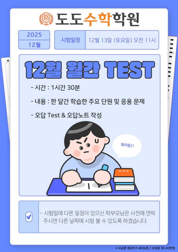 한 달 동안 배워온 내용이 얼마나 잘 이해되고 정리되었는지 스스로 점검할 수 있는 시간, 그리고 실수·약점을 정확하게 확인할 수 있는 중요한 테스트 ✍ 이번 12월에도 예정대로 월간 평가를 진행합니다. 실시 일정 ✔ 12월 13일(토) 오전 11시 시험은 약 1시간 30분 진행되며, 평가 후 바로 오답 테스트(재풀이)까지 진행됩니다. 시험 → 채점 → 틀린 문제 재풀이 → 오답정리 실력 점검은 물론 학습 완성의 마무리까지! 사전 안내 문자 발송! ➡ 시험 주 월요일에 학부모님께 안내 문자 발송 미리 일정과 주의사항을 확인하실 수 있도록 테스트 주가 시작되는 월요일에 문자 공지가 나갈 예정입니다. (미응시 발생을 줄이고....... <img src="https://blogthumb.pstatic.net/MjAyNTEyMDhfNjAg/MDAxNzY1MTc2MjA4NDYx.3gnBbvAwxB5quBgGuYhnFuwXEJ1DZK7kKRimJHenzRkg.GJbVdqytlSDA3L1nDO6cJrE1-377wuiQ41Gdbmg7lewg.JPEG/%C1%A6%B8%F1%C0%BB-%C0%D4%B7%C2%C7%D8%C1%D6%BC%BC%BF%E4_-001_%281%29.jpg?type=s3" />
