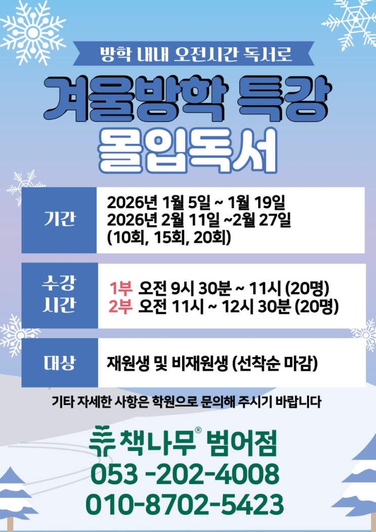 대치동 학원가에서 30초 안에 마감된 학원은 영어도, 수학도 아닌 책나무 오전 몰입독서였습니다. 수성구 책나무 범어점도 방학마다 오전 특강으로 몰입독서반을 운영하고 있습니다. 방학마다 재수강하는 친구 들이 늘어나고 있습니다. 이번 겨울방학과 봄방학을 수성구 책나무 범어점에서 준비한 오전 특강 몰입독서에 흠뻑 빠져보세요. 몰입독서는 다독/정독 중심의 독서특강으로 학기중에 책읽을 시간이 충분하지 않았던 학생을 위한 독서중심 특강입니다. ▶ 기간 2026년 1월 5일 - 1월19일 2월 11일~2월 27일 (설연휴, 토,일 제외) ▶ 수강시간 1부 오전 9시 30분 - 11시(20명) 2부 오전 11시 - 12시 30분(20명) 1.2학년은 70분 ▶ 대상 초....... <img src="https://blogthumb.pstatic.net/MjAyNTExMTRfMjA0/MDAxNzYzMDQ3ODUyMDE2.LfQw5_0NXOnpK-r_Q-G1TRsXKbukK3ERB9G8TI8jgKMg.cwljh5pDoRRSpyo_vrGiTW9YsznGLRbmxVmnYhYycjEg.JPEG/900%A3%DF1763033853281.jpg?type=s3" />