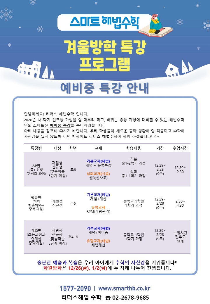 수미사 중계관] 은행사거리 수학학원 겨울방학 특강안내