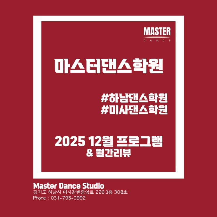 “MASTER DANCE STUDIO” “마스터댄스” 하남미사 | 5호선 미사역 Click ⬇️ Master Dance 둘러보기 ⬇️ Click 안녕하세요! 모두의 댄스학원 마스터댄스 입니다. 2025년 마지막 월간 리뷰 포스팅! 12월 프로그램 시간표 및 소식 전해드리겠습니다. 하남댄스학원 | 미사댄스학원 | 천호댄스학원 | 강동댄스학원 ※ 입시 전문반 / 초등 전문반 모집 중·고등학생 전문반 초등학생 전문반 현직 실용무용과 전임교수이신 원장님께서 직접 운영하시는 마스터댄스 실용무용 분야로 진로를 꿈꾸고 있는 학생들을 위한 최고의 공간 마스터댄스에서 함께 땀 흘릴 전문반 학생을 모집 중입니다. 탄탄한 커리큘럼과 개인별 맞춤 피드백 / 제한 없는 연습실....... <img src="https://blogthumb.pstatic.net/MjAyNTEyMDNfMzAg/MDAxNzY0NzMxNjk1MDI4.7pqzfw6RWFPO29rON1sWIX3MJfHQeFMQqKLeOea_x5og.BXsK44lNzXLILFfazuQTfm8USy4hvBchBW9E9rEjz24g.JPEG/2025_12_%BF%F9%B0%A3_%BA%ED%B7%CE%B1%D7_%C5%B8%C0%CC%C6%B2.jpg?type=s3" />