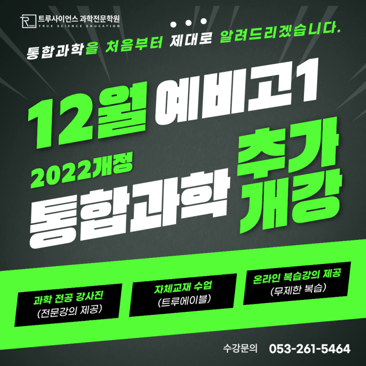 안녕하세요. 트루과학학원 입니다. '지난 11월' 예비고1 대상으로 개강된 <고1 통합과학, 고2 물리학, 고2 화학> 수업이 모든반 수강신청 마감되었습니다. 11월 수업을 놓친 학생들을 위하여 '12월 중순', 고등 과학 선행 수업을 추가 개강 합니다. 트루과학만의 강의 노하우로 고등 1등급 내신의 첫걸음으로 향하는 깊이가 다른 이론 수업에 함께 하고자 하는 학생은 아래 시간표를 참고하여 신청해주시길 바랍니다. 2025년 예비고1 겨울방학 특강 시간표 12월 개강 예비고1 대상-고등 과학 수업 관련 문의는 아래 번호로 전화해 주시면, 친절히 안내해 드리겠습니다. *문의 : 053-261-5464 , 053-264-5464 #트루과학....... <img src="https://blogthumb.pstatic.net/MjAyNTEyMTBfMTI4/MDAxNzY1MzY0MjI3MTY4.Abc813_juU7xLnMBSMM-sPpEK7BdJ57da0jHIBvCVfog.fxFmxsIMFwYyztjnYBUayM4TzYpB8G75-wAvCKzZ68Ag.PNG/%C1%A6%B8%F1%C0%BB_%C0%D4%B7%C2%C7%D8%C1%D6%BC%BC%BF%E4_%282%29.png?type=s3" />
