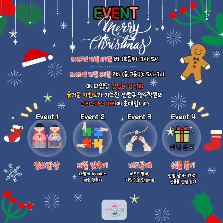 안녕하세요! 센텀큐 영수학원입니다 크리스마스가 다가오면서 아이들이 가장 기다리는 특별한 날이 되었죠! 올해도 센텀큐에서는 학생들이 즐겁게 참여할 수 있는 크리스마스 특별 이벤트를 준비했습니다. 학업에서 잠시 벗어나 친구들과 함께 웃고 즐기며 추억을 만들 수 있는 알찬 프로그램으로 구성했습니다. 행사 일정 안내 2025년 12월 24일(수) 1차(초등부): 3시 ~ 5시 2차(중·고등부): 5시 ~ 7시 각 타임마다 맛있는 간식과 다양한 활동이 준비되어 있어 참여만 해도 즐거운 크리스마스 파티가 될 거예요! 프로그램 소개 1. 영화 감상 편안하게 시작할 수 있는 영화 감상 시간! 친구들과 함께 웃으며 즐길 수 있는 콘....... <img src="https://blogthumb.pstatic.net/MjAyNTEyMTBfMTM5/MDAxNzY1MzY5NjI0NzQw.ArrgJBJfXsn3Z_8wd3LDlkivhSvl-Cg1ldn8ryTcvA4g.-pxauiVyd67g4bCrXt_5H7uVvOeDb8gof_7NhsgTIW4g.PNG/%C1%A6%B8%F1%C0%BB_%C0%D4%B7%C2%C7%D8%C1%D6%BC%BC%BF%E4.png?type=s3" />
