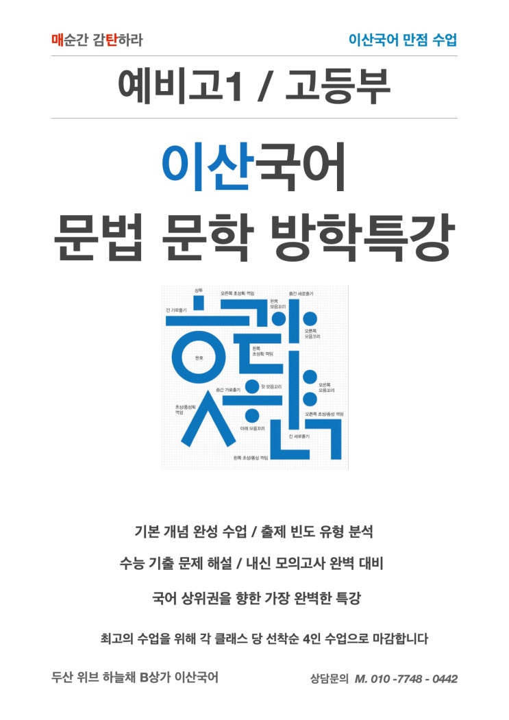 예비고1, 고등부반을 대상으로 한 이산국어만의 확실하고 완벽한 문법 특강 / 문학 특강 개강! 예비고1반은 한 달 먼저 시작합니다. <img src="https://blogthumb.pstatic.net/MjAyNTEyMDRfMTEw/MDAxNzY0ODMyOTY5MTYy.C3L7shDueYq1f0FQ7l0QYcQPL4GMCkeYkmddRwhcdB8g.hHQ4ZZ_65Vh-n5XkXBwC_ffBKYtpw611nCReSZUV13og.JPEG/%26lrm%3B%C0%CC%BB%EA%B1%B9%BE%EE%B1%A4%B0%ED06-1.%26lrm%3B1.jpeg?type=s3" />
