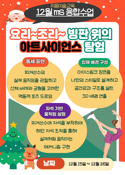 12월 크리스마스 특별수업은 미술과 과학을 융합한 <요리조리 ~ 빙판 위의 아트사이언스 탐험> 으로 진행될 예정입니다^^ 동작을 관찰하며 동세 표현 드로잉을 통해 균형·비례·움직임을 이해해 보고 입체적인 3D 배경을 직접 구성하며 공간감과 창의적 표현 능력을 키울 예정입니다~ 자석의 원리를 적용하여 실제처럼 움직이는 피겨선수를 만들 예정이니 많은 관심 부탁드려요^^ 실시간으로 올라가는 리움의 활동이 궁금하다면! 인스타그램 @_leeum_art를 팔로우 해주세요~~^^* 카카오톡 플러스친구 검색창에 '리움미술'을 검색하시면 리움 미술교육이 뜬답니다~!ㅎㅎ 궁금하신 점이나 문의사항이 있으면 언제든지 자유롭게 연락....... <img src="https://blogthumb.pstatic.net/MjAyNTEyMTBfMjM3/MDAxNzY1MzQ0OTQ0MDIy.3vgxctsKz_1f-BdcUWZLFJKvwAiN_TIHqoQ1r4QUHk0g.n2pTrEWEUpBHzeB8pFOw1hsQ-sLFvt5LVjJwg1Gu72gg.PNG/12%BF%F9%C0%B6%C7%D5%BC%F6%BE%F7-001.png?type=s3" />