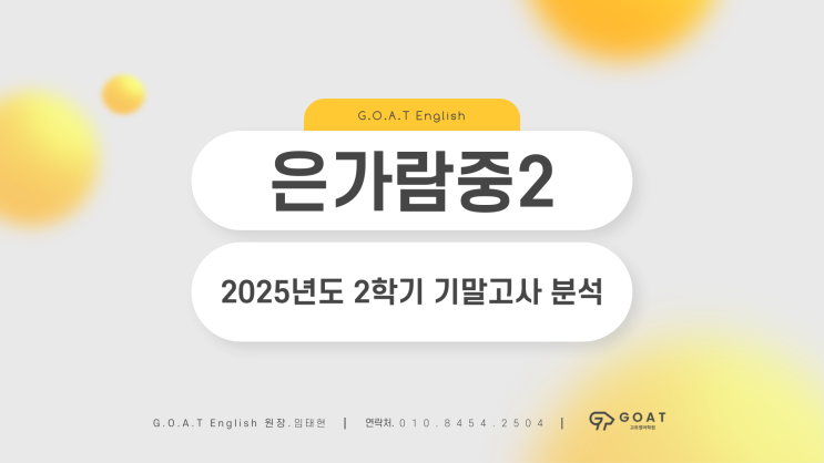 안녕하세요 고트영어입니다. 은가람중학교 2학년 영어 시험 총평 – 난이도는 낮았지만, 실수가 성적을 갈랐습니다 이번 은가람중학교 2학년 영어 시험은 전반적으로 지난 시험 대비 난이도가 낮게 출제되었습니다. 미사 지역에서 중등 내신 영어를 준비하는 학생들과 학부모님들 사이에서도 “생각보다 수월했다”는 반응이 많았던 시험입니다. 미사영어학원, 특히 미사중등내신영어학원 입장에서 보더라도 출제 방향이 비교적 명확했던 시험이었습니다. ① 전반적인 시험 난이도 — 중간 난이도 중심 구성 이번 시험에서는 기존과 달리 대화문 문항이 처음으로 포함되었지만, 그에 비해 난이도 ‘상’에 해당하는 문항 수는 줄어들며 전체적으....... <img src="https://blogthumb.pstatic.net/MjAyNTEyMTNfMTA3/MDAxNzY1NTYxNjMxOTcw.105fKypfWoklNquu6DL1EYSFli8N0WeCZNbOF0_pJIkg.uhtacOiq55tMclo3hlOybMGCG89TF7JR0vXR1WkyPOYg.PNG/%C0%BA%B0%A1%B6%F7%C1%DF2-2%C7%D0%B1%E2_%B1%E2%B8%BB-001.png?type=s3" />