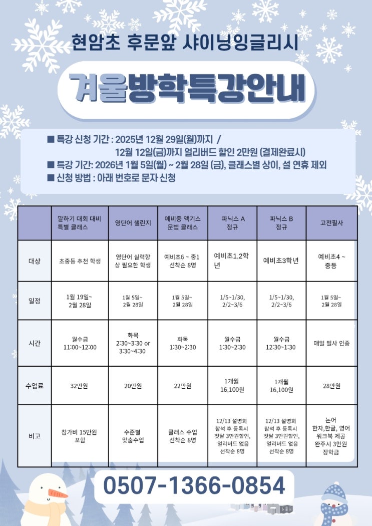 2025 겨울방학특강 안내 현암초 후문앞 샤이닝잉글리시