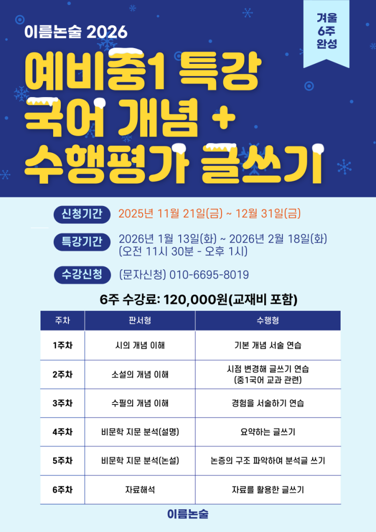 2026년에 중학 1학년이 되는 학생, 학부모님 중학교 입학을 앞두고 자녀의 어떤 부분이 가장 우려되시나요? 이름논술의 예비중 겨울방학 특강은 중학 국어의 기본 개념을 '수행평가 글쓰기' 역량 기르기와 함께 학습하며, 흔들림 없는 독해/서술 능력을 완성할 수 있도록 합니다. 수행평가와 서술형 논제로 채워진 많은 과제들에 치이지 않도록, 겨울 방학 특강을 계획하였습니다. 신청방식 * 문자 신청: 010 6695 8019 (학생명/학교명 문자에 포함하여 신청해 주세요) 신청이 완료되면 학부모님께 수업 관련 추가 커리큘럼 및 안내문이 발송됩니다. <img src="https://blogthumb.pstatic.net/MjAyNTExMjNfMTY2/MDAxNzYzODg4NjgxNDE3.6KBSX6P4rhc9R7R4IjE6qebTOIFlAU7SO2BmoS8TKjUg.l7arfRVW5jRH6r6jv6hQPl3Yu8I8Q0oedoM8WEpl5N8g.PNG/%B0%DC%BF%EF%B9%E6%C7%D0%C6%AF%B0%AD_%C6%F7%BD%BA%C5%CD.png?type=s3" />