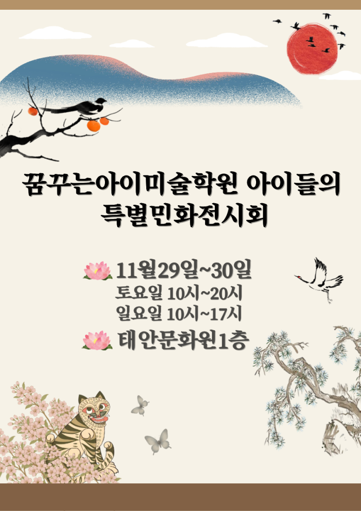안녕하세요! 29일,30일에 열렸던 꿈꾸는아이미술전시회를 잘 마치고 전시회준비사진부터 많은분들이 찾아주셔서 빛이났던 전시회장 모습까지 사진으로 담았습니다. 우선 이번 전시회테마는 전통민화였습니다. 아이들에게는 더욱 생소할수있던그림이였지만 케이팝데몬헌터스의 열기로 생각보다 쉽게 다가갈수있었고 아이들과 충분한 이야기들을 나누면서 본인만의 그림을 그릴수있었습니다. 특히 이번캔버스액자작품은 아크릴작품이라 아이들이 평소 사용하는 수채화물감과는 다른질감의 아크릴물감을 사용해서 시간소요도 많이되고 생각보다 더욱 정성이 필요했던 작품입니다. (아이들정말정말 고생했어요^^) 전시회장에 찾아준 작가님들,가족분....... <img src="https://blogthumb.pstatic.net/MjAyNTEyMDNfNzcg/MDAxNzY0NzI2MTc1NTE2.NWd05LJYIpFz_NusDFcQDzaKexbUIdARsOHUgSQYKy4g.BGWdPRWWdx_nS3SWu0_AdBOXwJnSc3Bi8dRLF-Jr78gg.PNG/%B9%CE%C8%AD%C0%FC%BD%C3%C8%B8%B9%AE%C0%DA.png?type=s3" />