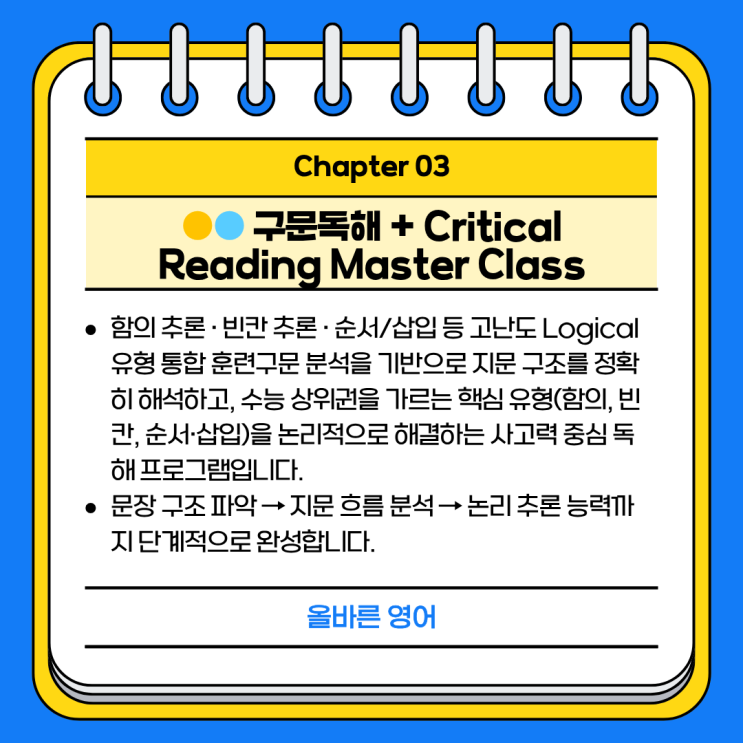 ● 구문독해 + Critical Reading Master Class 특강 수능 상위권 학생들을 결정짓는 진짜 실력은 단순 어휘력이나 감(感)이 아닙니다. 문장을 정확히 해석하는 기초 체력 + 지문 전체의 논리 구조를 파악하는 독해력 + 고난도 문제를 뚫는 추론 능력이 종합될 때 비로소 안정적인 1등급이 만들어집니다. 이번 Critical Reading Master Class는 이러한 핵심 요소를 한 번에 완성하는 프로그램으로, 수능에서 가장 변별력을 갖는 함의 추론, 빈칸 추론, 순서·삽입 유형을 구문 분석 기반으로 훈련하는 고난도 독해 특강입니다. ● 수업 구성: “문장 → 단락 → 전체 지문”으로 이어지는 단계적 독해 지문 구조 파악 훈련 문단 간 연결 신호어, 전....... <img src="https://blogthumb.pstatic.net/MjAyNTEyMTFfMTM0/MDAxNzY1NDQ1MDIyODAx.YJZ3XYKm2W50lr8lpLSFeBmGvA3dsB4oz8IU25qKdoQg.JZD42Xtl2YWaEVCQa64Yu0j0gCFwtDWabNLygJllJRAg.PNG/4.png?type=s3" />