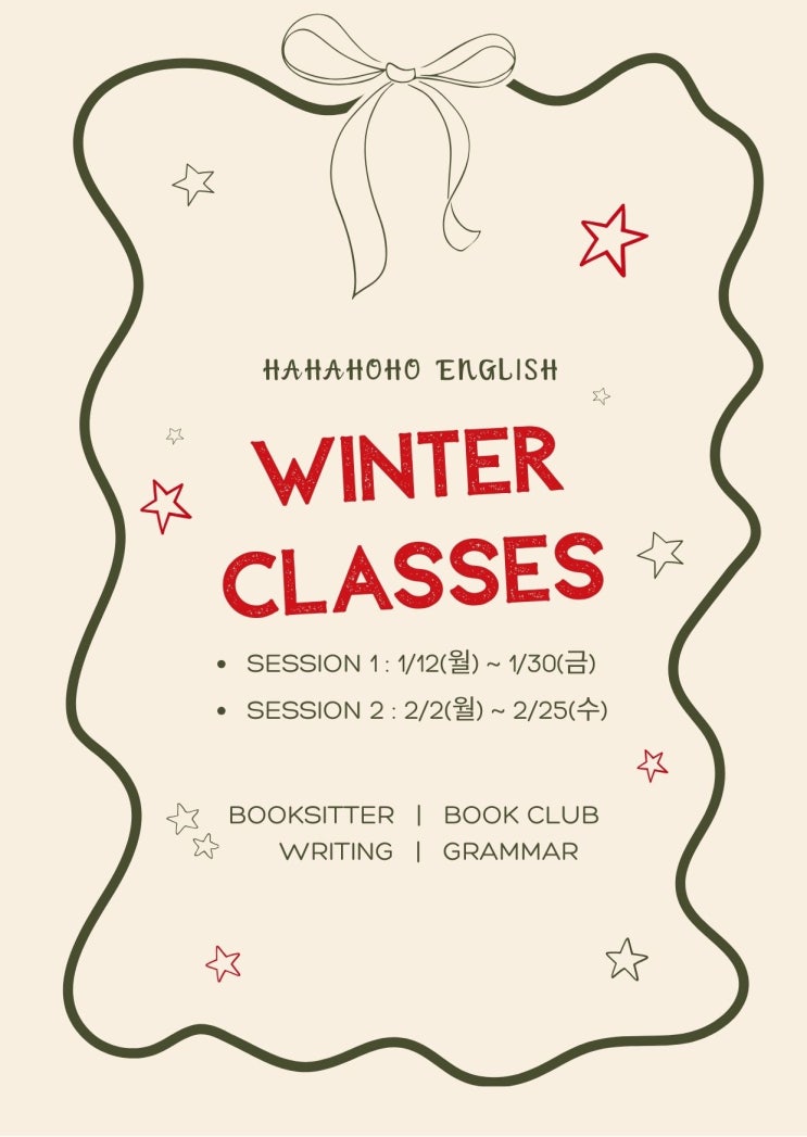 안녕하세요 하하호호 영어입니다 :) 벌써 12월이라니... 믿기지가 않네요 2025년은 시간이 정말 쏜살같이 지나간 것 같아요~ 어느덧 우리 친구들의 길고 긴 겨울 방학이 다가오고 있어요. 겨울 방학을 잘 대비해서 알찬 겨울 방학을 보내면 너무 좋겠죠? 이번 겨울 방학 특강도 Section 1, 2로 나누어지며, Book Club / Booksitter/ Writing/ Grammar 다양하게 준비되었습니다. Booksitter Session 1, 2 모두 진행되는 영어 도서관 수업입니다. 원하는 시간을 네이버 예약(타임 당 정원 6명)으로 예약하고 예약한 시간에 원에 와서 책을 읽고 8~10단계 과제들을 수행하는 다독 프로그램입니다. Writing "Essay 쉽게 쓰는 방법" Wri....... <img src="https://blogthumb.pstatic.net/MjAyNTEyMDFfMjU3/MDAxNzY0NTY3NzUwMDY4.oN1T8Op_cDuHftcxgAPsUXMKx2quQmeU0oRubSHO2-Ug.HtpQMxodkjYCCNIFJkKD9K0Kadh7w4T0cjZww6qMQZog.JPEG/1.jpg?type=s3" />